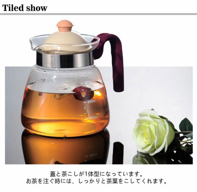 直火可の耐熱ガラスのティーポットです。蓋と茶こしが1体型になっています。お茶を注ぐ時には、しっかりと茶葉をこしてくれます。透明なガラスポットで紅茶はもちろん、緑茶や中国茶など様々な種類のお茶を淹れることで、目に見る美しさも楽しむことができます。全てのパーツがシンプルなデザインなのでお手入れも簡単で、毎日の生活の中でカジュアルに使用できます。※ティーポットは電磁調理器の鍋での加熱には対応しておりませんので、直火で加熱する場合は炎がティーポットの底を超えないようにご注意ください。