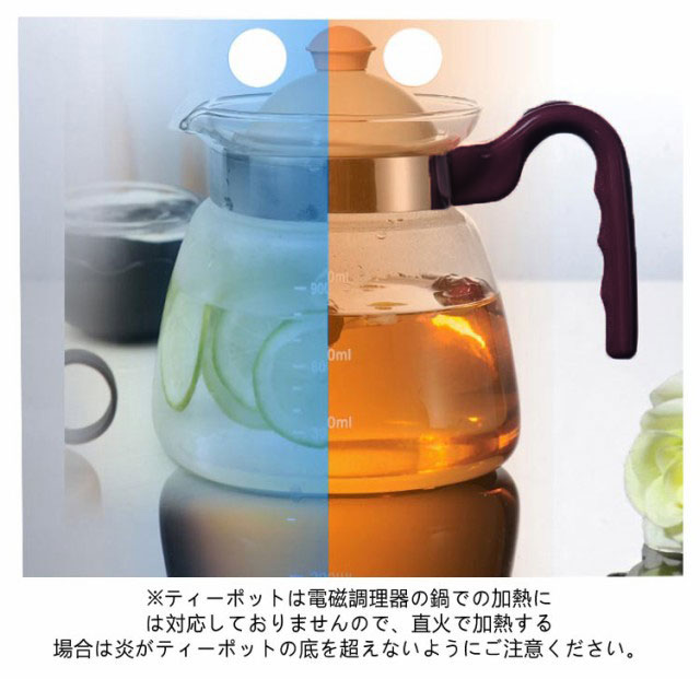 | 直火可の耐熱ガラスのティーポットです。 蓋と茶こしが1体型になっています。お茶を注ぐ時には、しっかりと茶葉をこしてくれます。 透明なガラスポットで紅茶はもちろん、緑茶や中国茶など様々な種類のお茶を淹れることで、目に見る美しさも楽しむことができます。 全てのパーツがシンプルなデザインなのでお手入れも簡単で、毎日の生活の中でカジュアルに使用できます。 ※ティーポットは電磁調理器の鍋での加熱には対応しておりませんので、直火で加熱する場合は炎がティーポットの底を超えないようにご注意ください。 | |