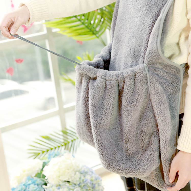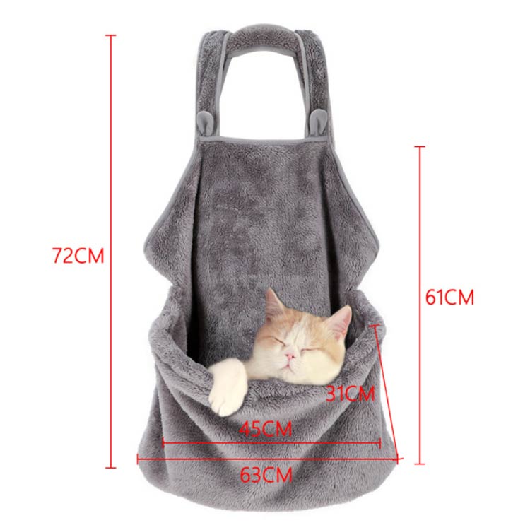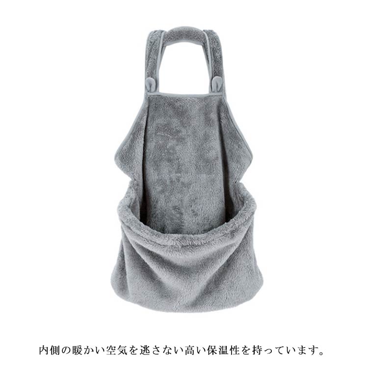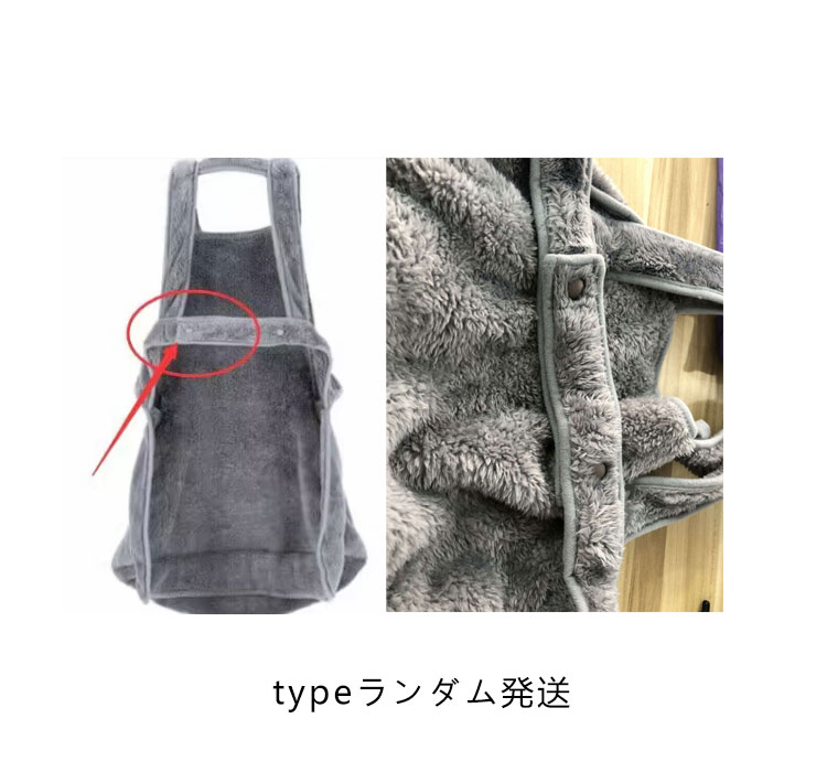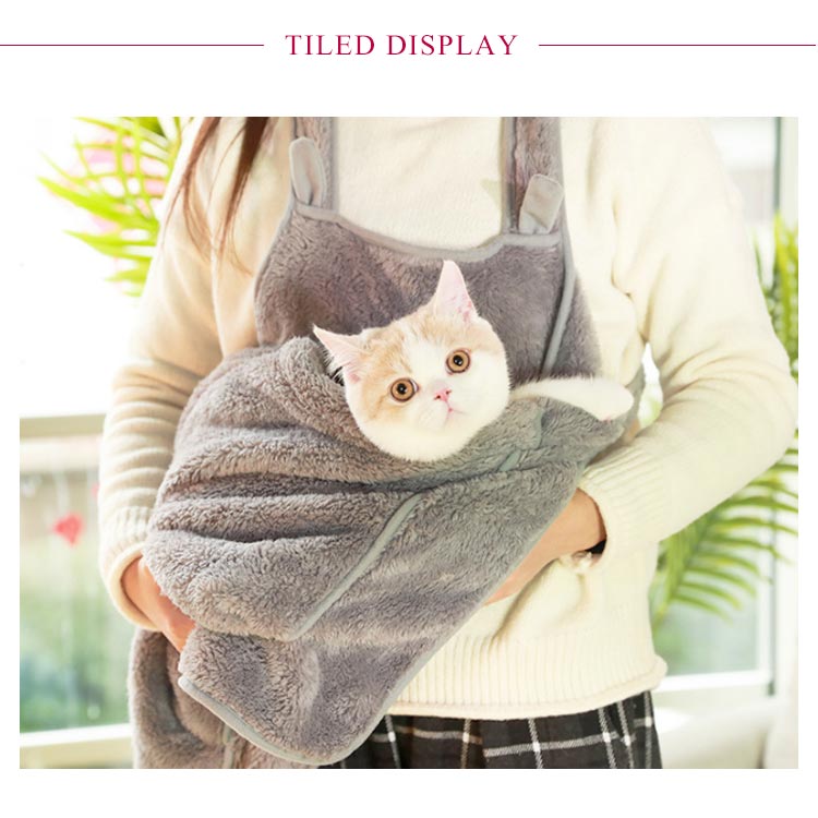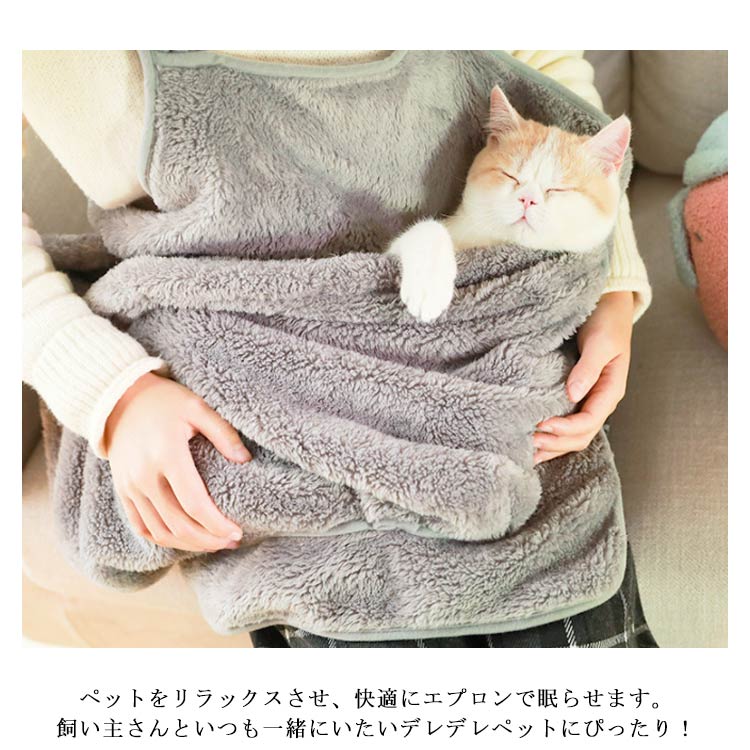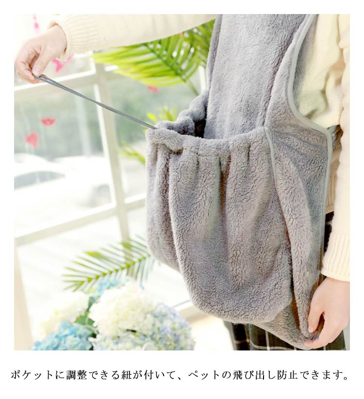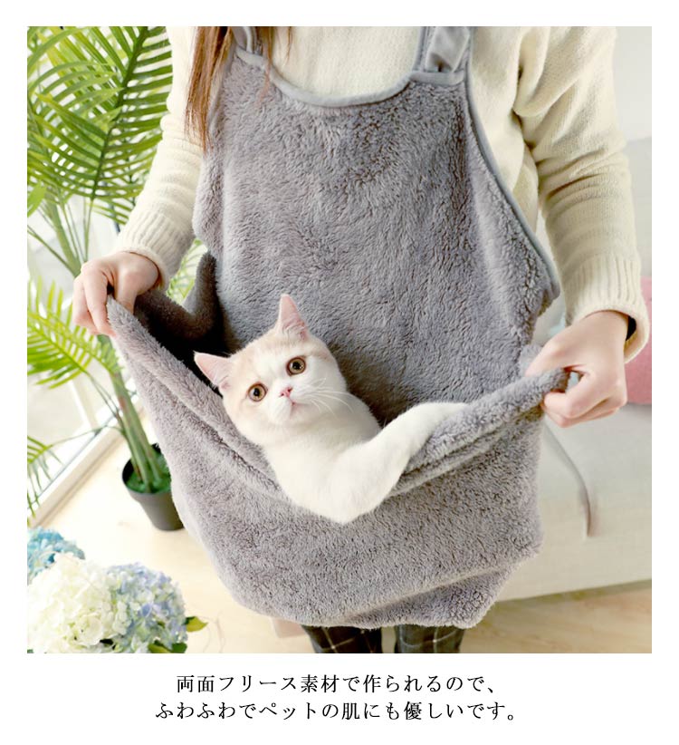 ふわふわで猫や小型犬を入れるためのエプロンです!抱っこ用エプロンなら毛が付くことが心配しなくて楽にペットを抱くことができます。ペットをリラックスさせ、快適にエプロンで眠らせます。飼い主さんといつも一緒にいたいデレデレペットにぴったり!両面フリース素材で作られるので、ふわふわでペットの肌にも優しいです。内側の暖かい空気を逃さない高い保温性を持っています。繊細の密度が高くて、脱毛しにくいです。冬秋にもおすすめいたします。ポケットに調整できる紐が付いて、ペットの飛び出し防止できます。後ろがボタンが付いており、着脱も楽になります。猫耳の形で、見た目可愛すぎます!大きいポケットなので、7.5kg以内の猫ちゃんやワンチャンにすっぽり!手洗いあるいは洗濯機で簡単に洗濯できます。いつでも清潔に保てます。