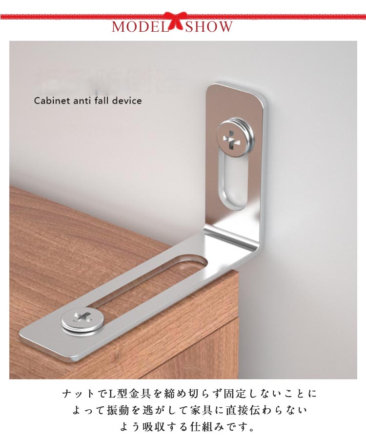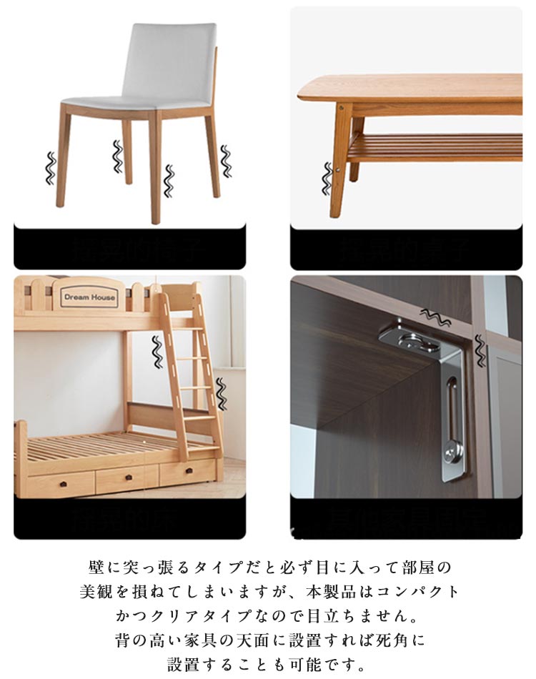 【免震構造】ナットでL型金具を締め切らず固定しないことによって振動を逃がして家具に直接伝わらないよう吸収する仕組みです。【コンパクト】壁に突っ張るタイプだと必ず目に入って部屋の美観を損ねてしまいますが、本製品はコンパクトかつクリアタイプなので目立ちません。背の高い家具の天面に設置すれば死角に設置することも可能です。【複数設置で耐震強化!】天面でも側面でも設置することができます。家具の大きさに合わせて複数設置することで耐震を強化することができます。【スペース節約、きれいを保持】余計のデザインがなし、同類商品と比べて、大幅にスペースを節約しました。取り付けた後に部屋はきれいなままで、必要な時だけにあなたとご家族の安全をしっかり守れます。