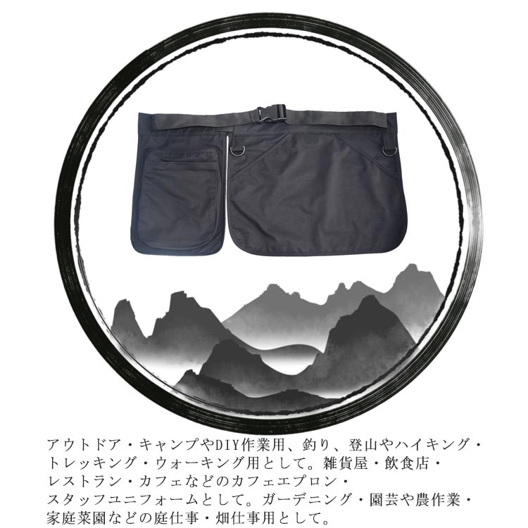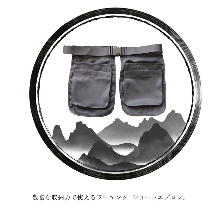 豊富な収納力で使えるワーキング ショートエプロン。ウエストポーチのような感覚で便利に使えるツールエプロン。機能的なポケットがたくさんついています!必要なものがすぐに出てくる優れもの♪動きやすいショートサイズ。スリットも入っているので、つけているのを忘れるくらいです。バックルでワンタッチで着けはずしOK♪ さっとつけてさっとはずせます。無地で落ち着いたカラーなので女性用だけではなく男性も使えます。コンパクトになるので持ち運びも楽ちんです。アウトドア・キャンプやDIY作業用、釣り、登山やハイキング・トレッキング・ウォーキング用として。雑貨屋・飲食店・レストラン・カフェなどのカフェエプロン・スタッフユニフォームとして。ガーデニング・園芸や農作業・家庭菜園などの庭仕事・畑仕事用として。