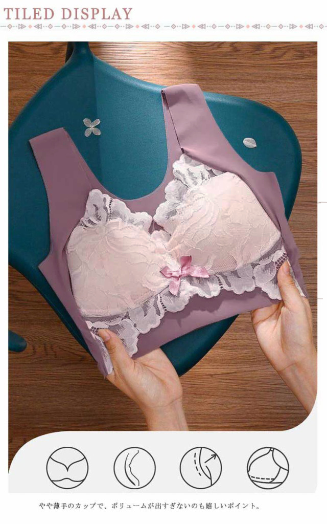 | スーパーストレッチで着用感ゼロ!大きな胸を小さく見せるブラ。 やや薄手のカップで、ボリュームが出すぎないのも嬉しいポイント。 ノンワイヤーで窮屈感を軽減。 花柄レースがしっかり胸をつつんで綺麗なシルエットを作ります。 脇高仕様で脇のお肉をしっかりとおさえ、大きな胸のすっきり細見えを実現します。 ストラップも太目仕様なので、肩への食い込みも軽減されます。 特有のU字型バックストラップで背中をフラットに抑え、スッキリとした後ろ姿に。 | |