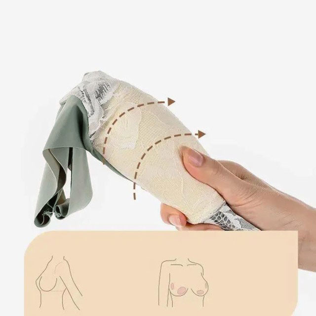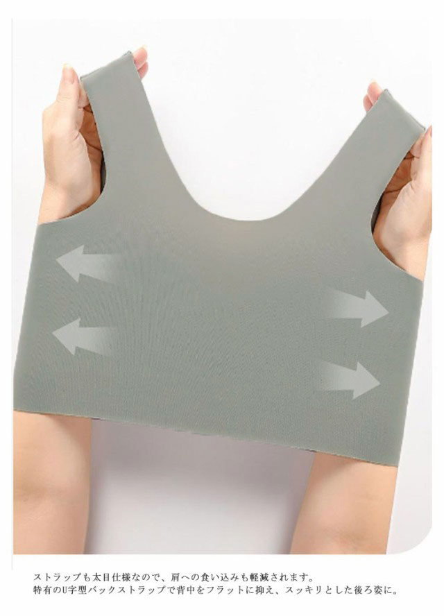 スーパーストレッチで着用感ゼロ!大きな胸を小さく見せるブラ。やや薄手のカップで、ボリュームが出すぎないのも嬉しいポイント。ノンワイヤーで窮屈感を軽減。花柄レースがしっかり胸をつつんで綺麗なシルエットを作ります。脇高仕様で脇のお肉をしっかりとおさえ、大きな胸のすっきり細見えを実現します。ストラップも太目仕様なので、肩への食い込みも軽減されます。特有のU字型バックストラップで背中をフラットに抑え、スッキリとした後ろ姿に。