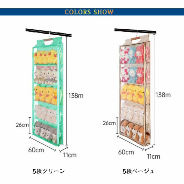| 【ぬいぐるみウォールポケット】【5段/6段収納ケース】 スタイリッシュデザインのディスプレイラックです。 透明度の高いビニールになっていて、中に入れたものをディスプレイしながら壁面に収納できるアイテム。 左右から開閉可能な両開きファスナー、お手入れと取出しがより便利、入れ替えなども楽々! 密閉設計で湿気やホコリを遮断し、大切なコレクションを守ります。 【使用場所自由自在】3種類のフックが付いているので、マルチな掛け方があり、ドア後?壁面?棚?クローゼット側などさまざまな場所で活躍する収納です。 使わない時は、折りたたんでコンパクトに収納でき、保管も邪魔にならない、人気のかばんラックです。 | |