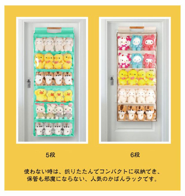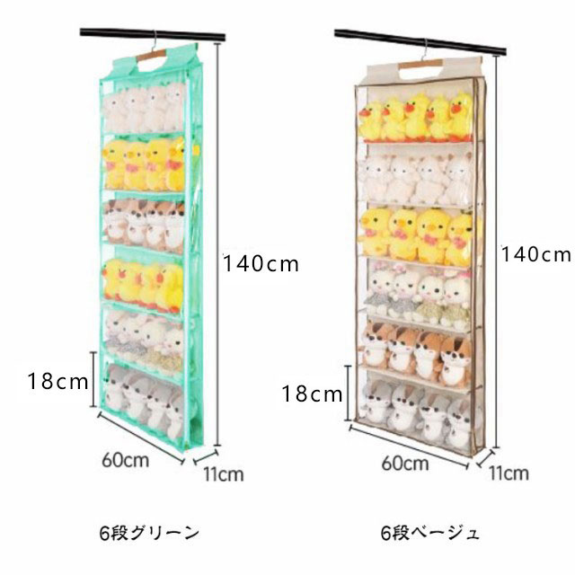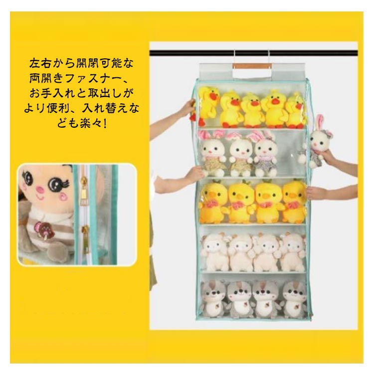 【ぬいぐるみウォールポケット】【5段/6段収納ケース】スタイリッシュデザインのディスプレイラックです。透明度の高いビニールになっていて、中に入れたものをディスプレイしながら壁面に収納できるアイテム。左右から開閉可能な両開きファスナー、お手入れと取出しがより便利、入れ替えなども楽々!密閉設計で湿気やホコリを遮断し、大切なコレクションを守ります。【使用場所自由自在】3種類のフックが付いているので、マルチな掛け方があり、ドア後・壁面・棚・クローゼット側などさまざまな場所で活躍する収納です。使わない時は、折りたたんでコンパクトに収納でき、保管も邪魔にならない、人気のかばんラックです。