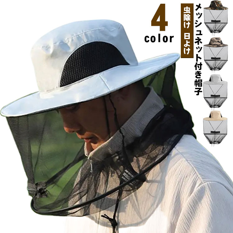 【虫除け 日よけ】【メッシュネット付き帽子】【4colors】虫の侵入を防ぐネット付き帽子です、通気性がいい。あご紐付きなので風にも飛ばされにくくなっています。360°取り囲むネットシールドで蚊や蜂、その他虫から守ってくれる。吸汗速乾にも通気性にも優れ、快適な着心地!被っても視界は非常に良好、高密度ですのでやぶ蚊や虫、蜂、アブ、ブヨ、ハエなどからの顔や首の虫刺されや羽音 を気にせず快適に屋外での作業に集中できます。ネットを使わない時はつばの上部に折りたたみ、普通の帽子として使える。
