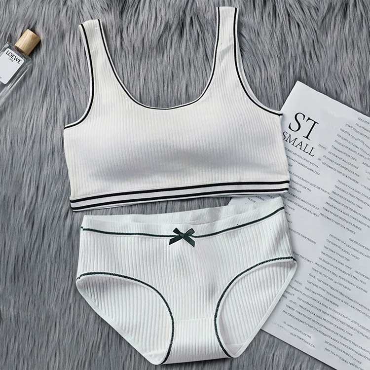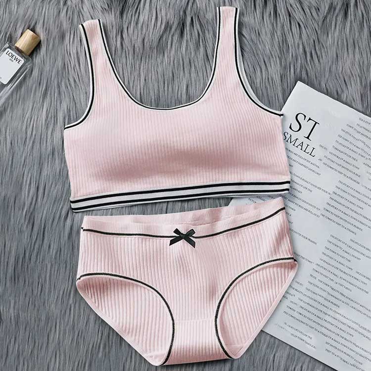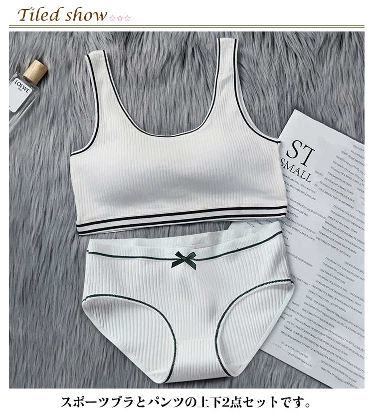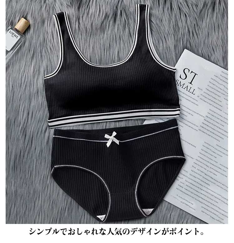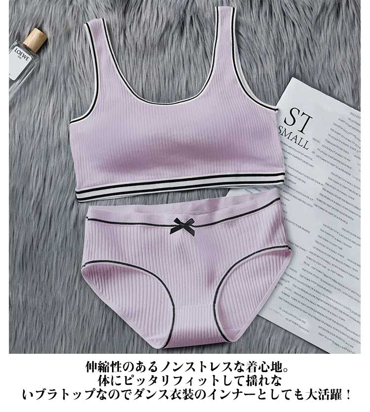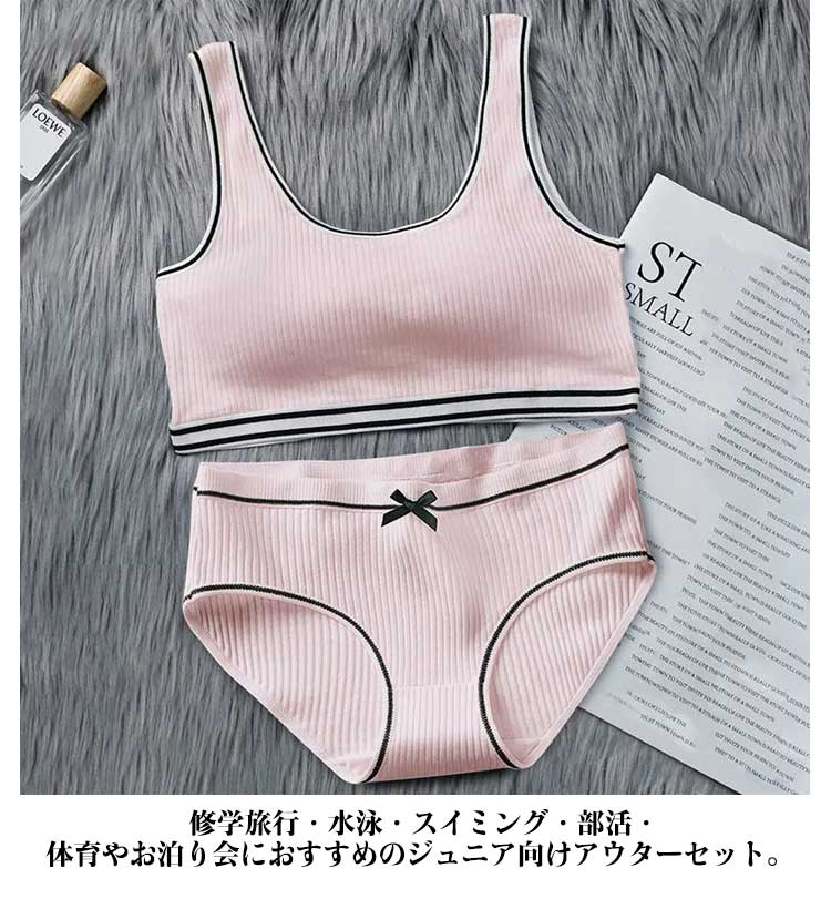 学生高学年~中学生向け女の子用下着。スポーツブラとパンツの上下2点セットです。 コットン素材で気持ちいい肌触り。修学旅行・水泳・スイミング・部活・体育やお泊り会におすすめのジュニア向けアウターセット。 シンプルでおしゃれな人気のデザインがポイント。 使いやすくて安い定番カラーをご用意。 伸縮性のあるノンストレスな着心地。体にピッタリフィットして揺れないブラトップなのでダンス衣装のインナーとしても大活躍! 見えてもかっこいいスポブラなので、ブラジャーはまだ早いキッズのチューブトップやブラトップとしても安心して着用いただけます