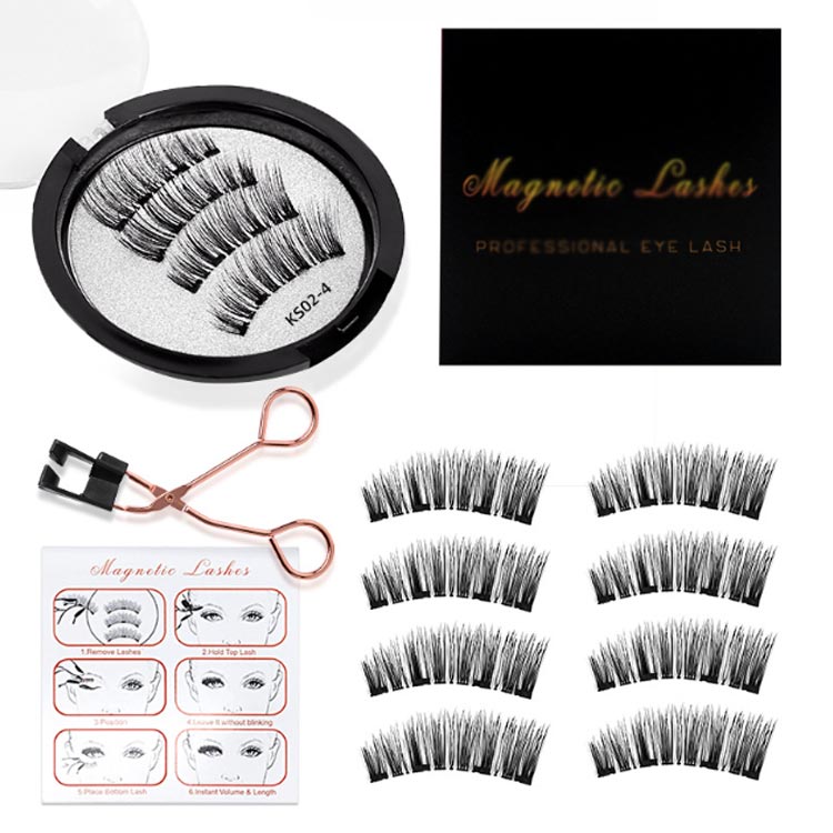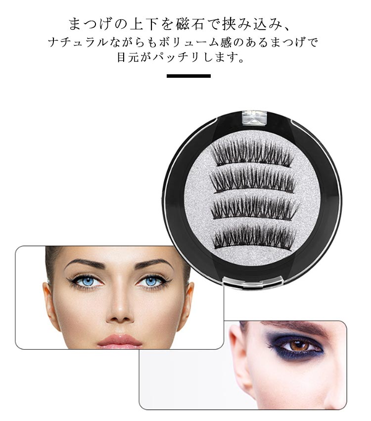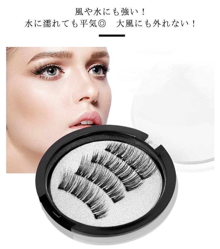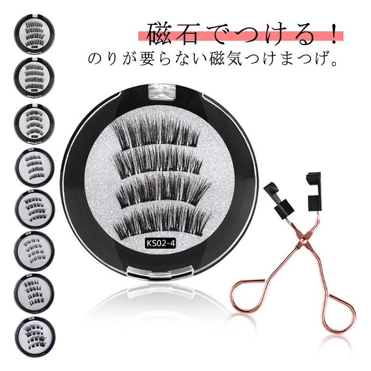 磁石でつける!のりが要らない磁気つけまつげ。接着剤不要!わずか3秒で美しく自然なまつげを実現できます。風や水にも強い!水に濡れても平気◎ 大風にも外れない!付属の専用カーラーにもマグネットが付いていて取り付けも簡単、一瞬でフィットするので超時短です。まつげの上下を磁石で挟み込み、ナチュラルながらもボリューム感のあるまつげで目元がパッチリします。付け直しも簡単にできるので、つけまつげ初心者の方でも使いやすいです。8種のまつげパターンから選べるのでナチュラルな仕上がりです。●装着方法 1.つけまつげ同士を剥がしてクリップのカーブに合わせます。2.磁石同士が向かい合うようにまつ毛をセットします。3.クリップのtop部分を上まぶたのまつ毛の生え際に合わせます。4.クリップを握り、下のまつ毛を自まつ毛に挟み込んで装着完了!