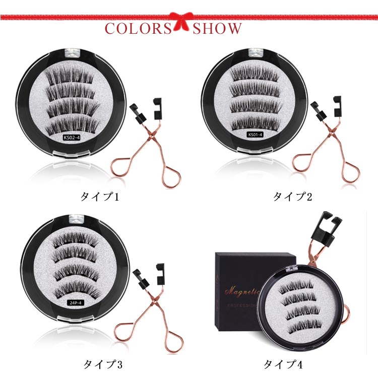 | 磁石でつける!のりが要らない磁気つけまつげ。 接着剤不要!わずか3秒で美しく自然なまつげを実現できます。 風や水にも強い!水に濡れても平気◎ 大風にも外れない! 付属の専用カーラーにもマグネットが付いていて取り付けも簡単、一瞬でフィットするので超時短です。 まつげの上下を磁石で挟み込み、ナチュラルながらもボリューム感のあるまつげで目元がパッチリします。 付け直しも簡単にできるので、つけまつげ初心者の方でも使いやすいです。 8種のまつげパターンから選べるのでナチュラルな仕上がりです。 ●装着方法 1.つけまつげ同士を剥がしてクリップのカーブに合わせます。 2.磁石同士が向かい合うようにまつ毛をセットします。 3.クリップのtop部分を上まぶたのまつ毛の生え際に合わせます。 4.クリップを握り、下のまつ毛を自まつ毛に挟み込んで装着完了! | |