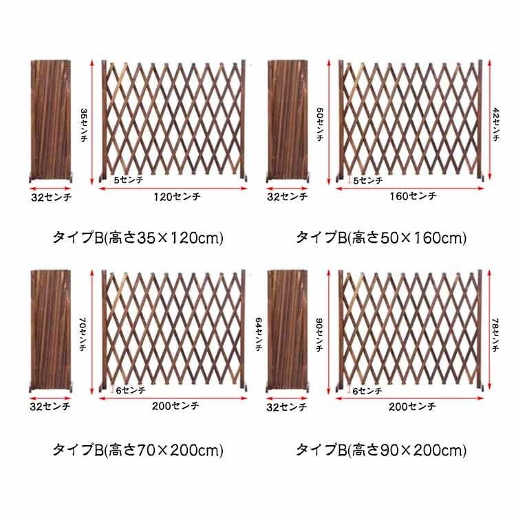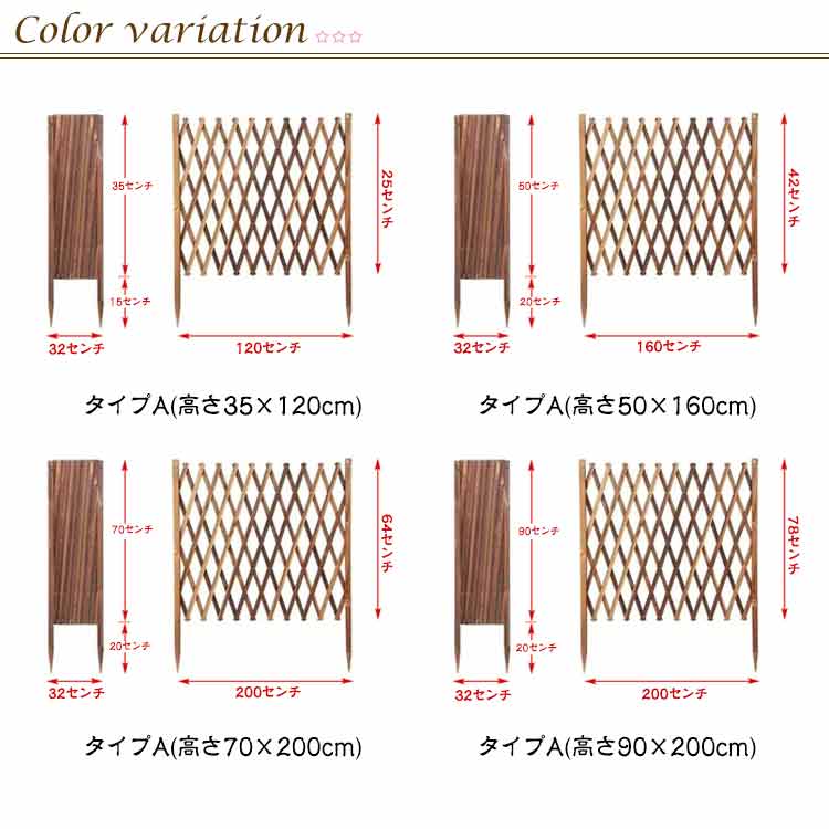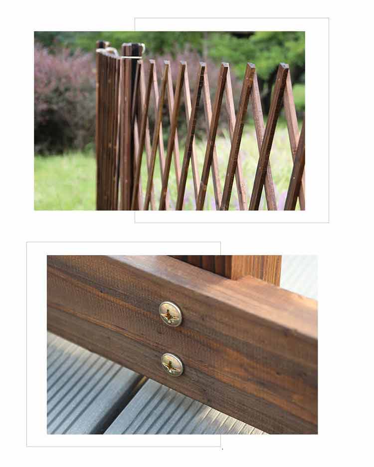 | アコーディオンのように伸ばして広げるフェンス。 自立式なので場所を選びません。 垣、フェンス、ゲート目隠しなど様々な使用シーンで活躍。 天然木製の自然な風合いが室内、室外問わず馴染みます。 簡単設置、閉じれば移動もコンパクトでラクラク? 取り付け:1.品物がきちんとしているかどうかを確認し、台座を横から留めて安定を保ちます。2.付属のドライバーで側面のねじを回す3.付属のドライバーで裏側のネジを回し、三角側は柵の裏側にあります。4.以上の手順で反対側の台座を取り付けして安装完了。 | |
