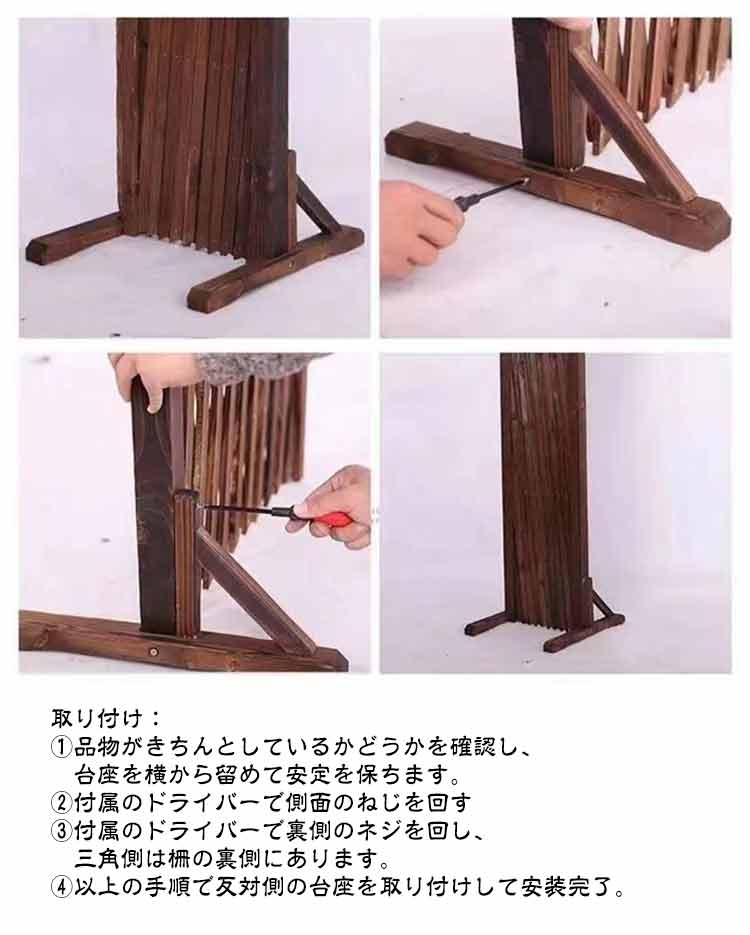 アコーディオンのように伸ばして広げるフェンス。自立式なので場所を選びません。垣、フェンス、ゲート目隠しなど様々な使用シーンで活躍。天然木製の自然な風合いが室内、室外問わず馴染みます。簡単設置、閉じれば移動もコンパクトでラクラク♪取り付け:1.品物がきちんとしているかどうかを確認し、台座を横から留めて安定を保ちます。2.付属のドライバーで側面のねじを回す3.付属のドライバーで裏側のネジを回し、三角側は柵の裏側にあります。4.以上の手順で反対側の台座を取り付けして安装完了。