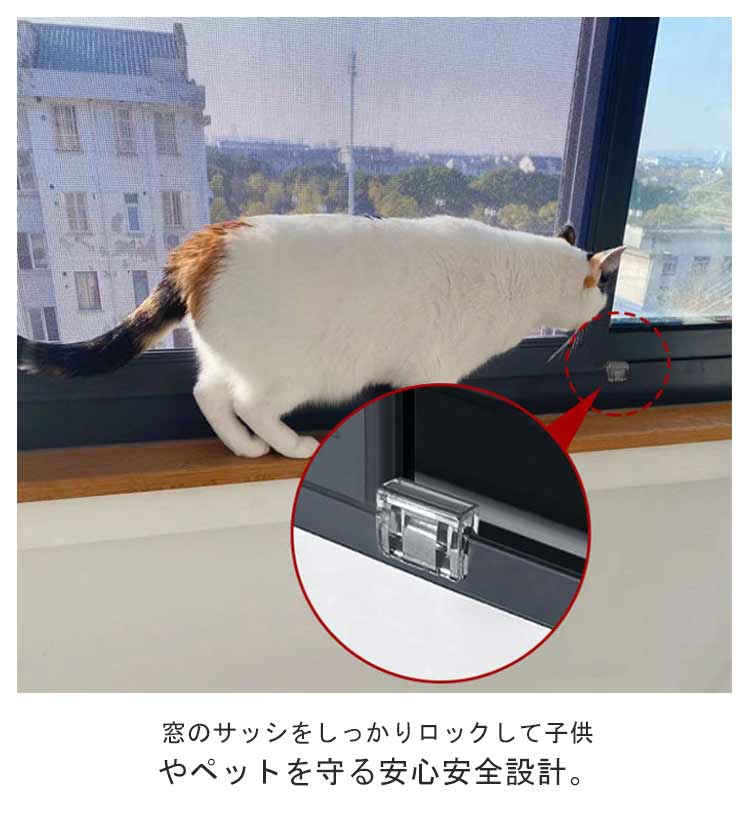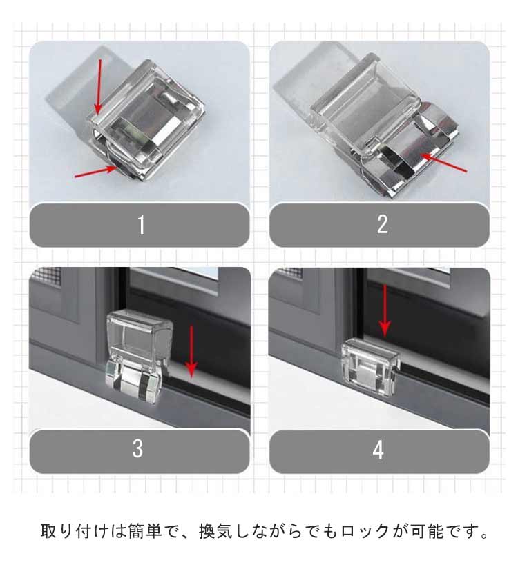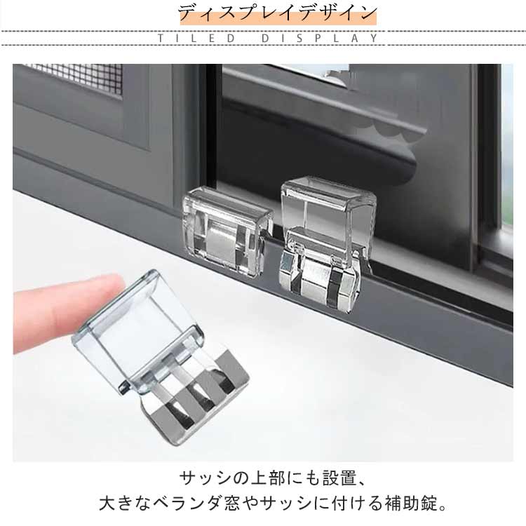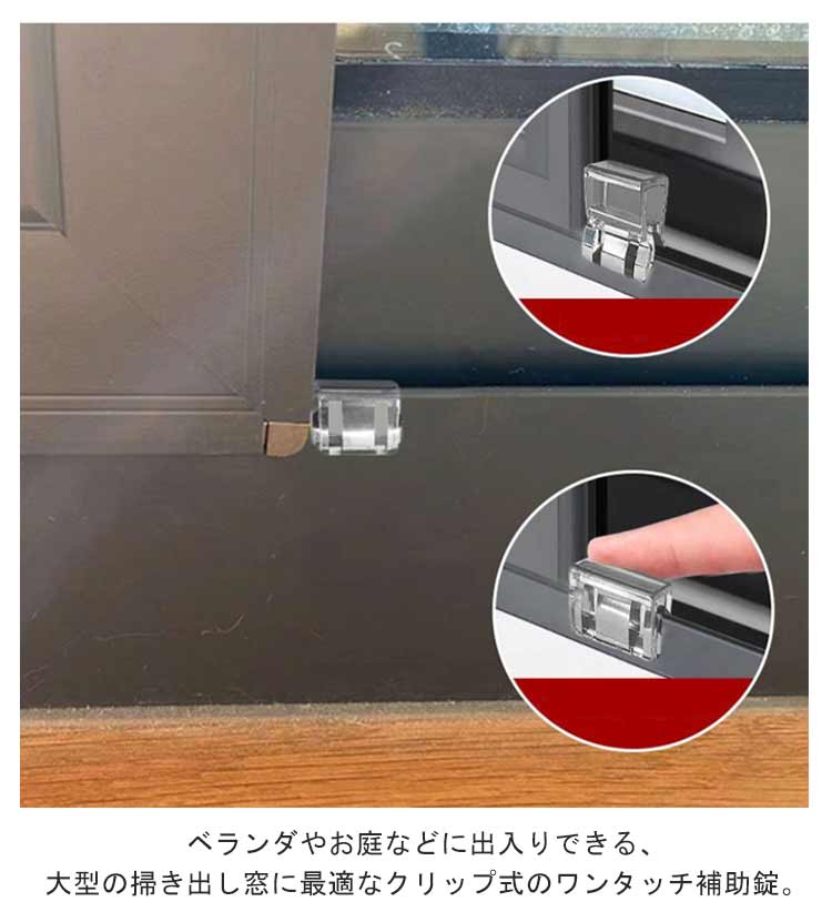 | サッシの上部にも設置、大きなベランダ窓やサッシに付ける補助錠。 ベランダやお庭などに出入りできる、大型の掃き出し窓に最適なクリップ式のワンタッチ補助錠。 窓のサッシをしっかりロックして子供やペットを守る安心安全設計。 カギの開け閉めを覚えたばかりの小さなお子様のイタズラ対策や勝手に窓のカギを開けてしまう危険も防止。 取り付けは簡単で、換気しながらでもロックが可能です。 | |