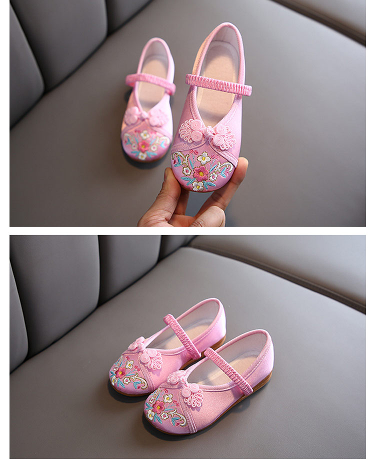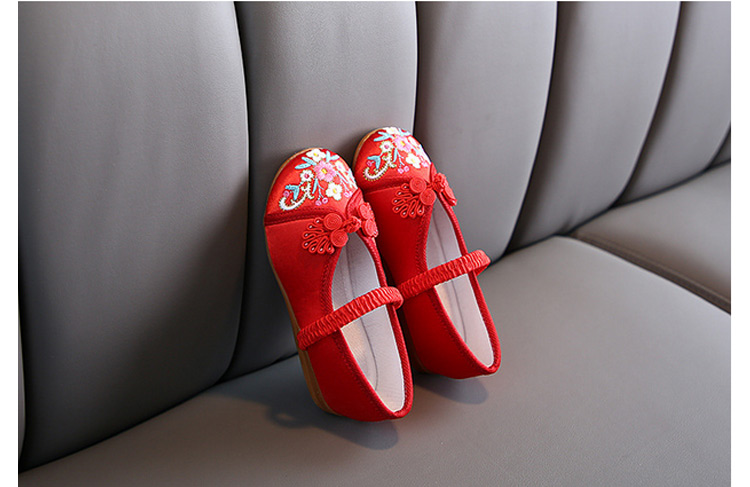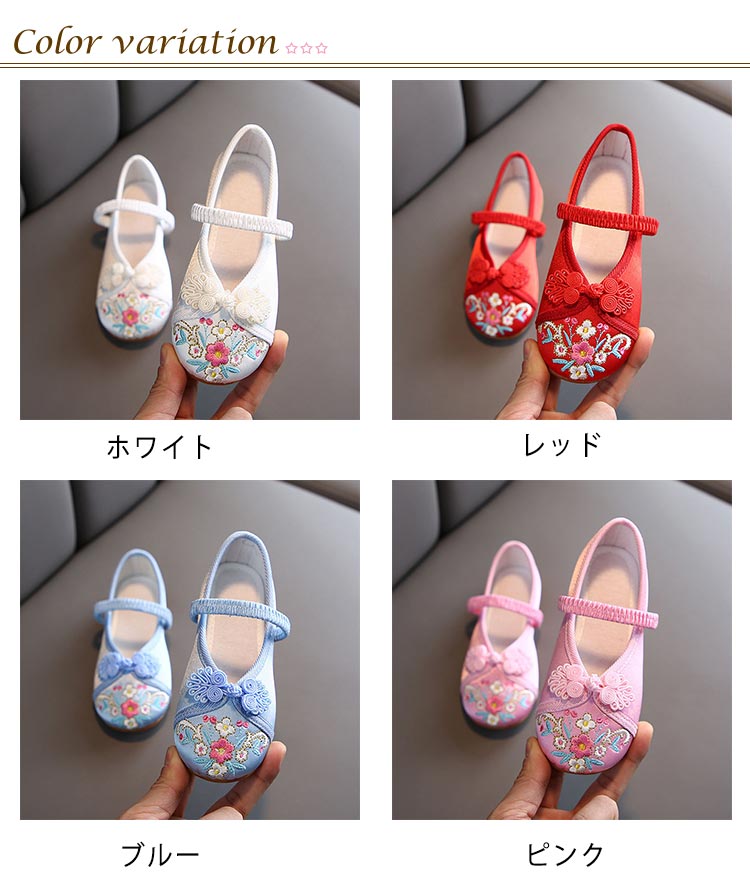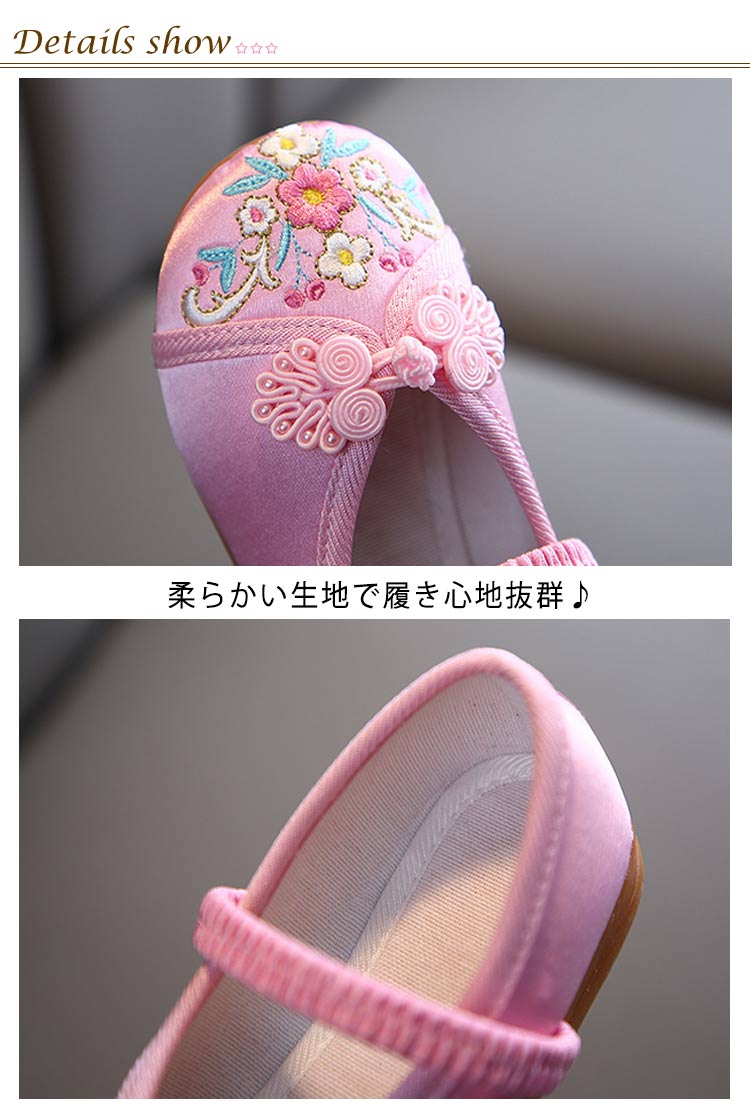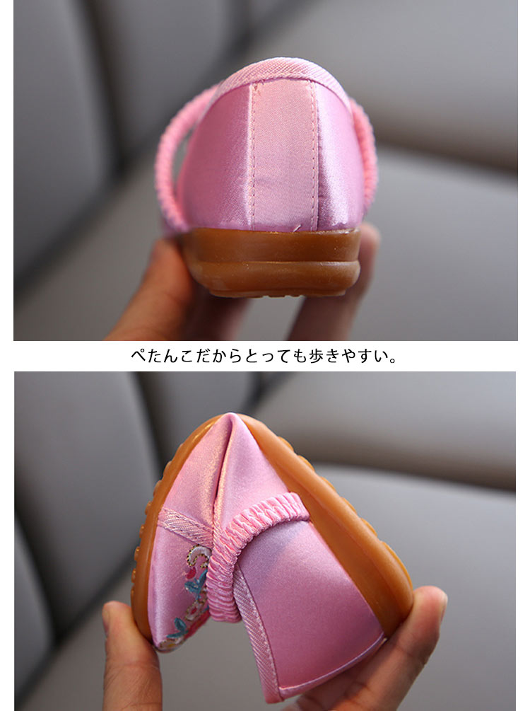 | 花が刺繍された可愛い七五三の靴です。 ゴムの甲ベルトも付いているのですぽっと脱げてしまうこともありません。 ぺたんこだからとっても歩きやすい。 柔らかい生地で履き心地抜群? | |