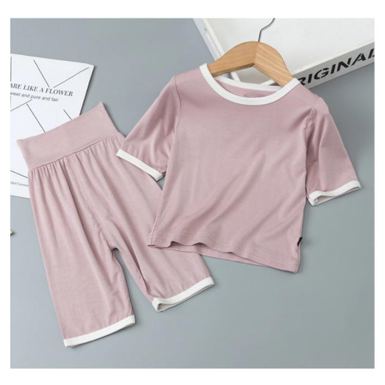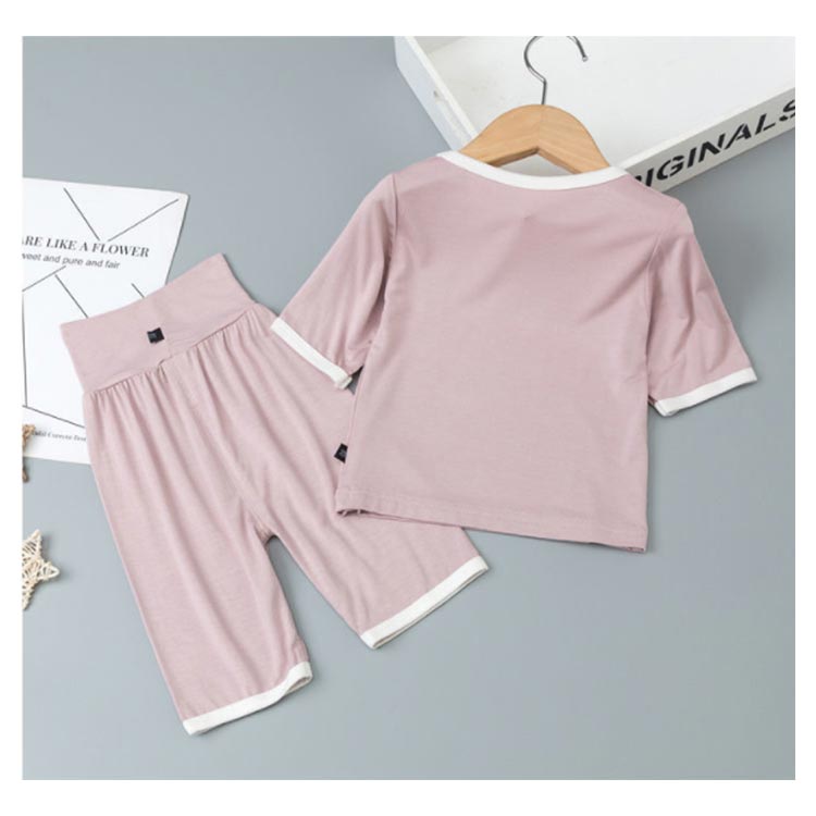 5分袖・5分丈ズボンの上下セットのパジャマ。やわらかな腹巻きがパンツについているのでお腹が冷えにくい。滑らかで肌触り良く、吸湿性にも優れた綿100%のスムース素材。