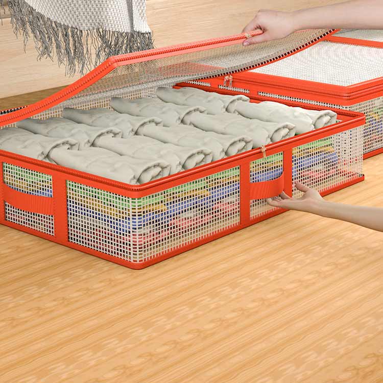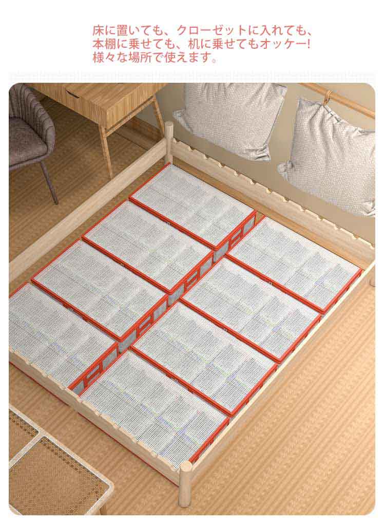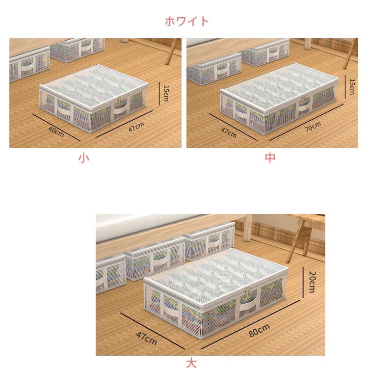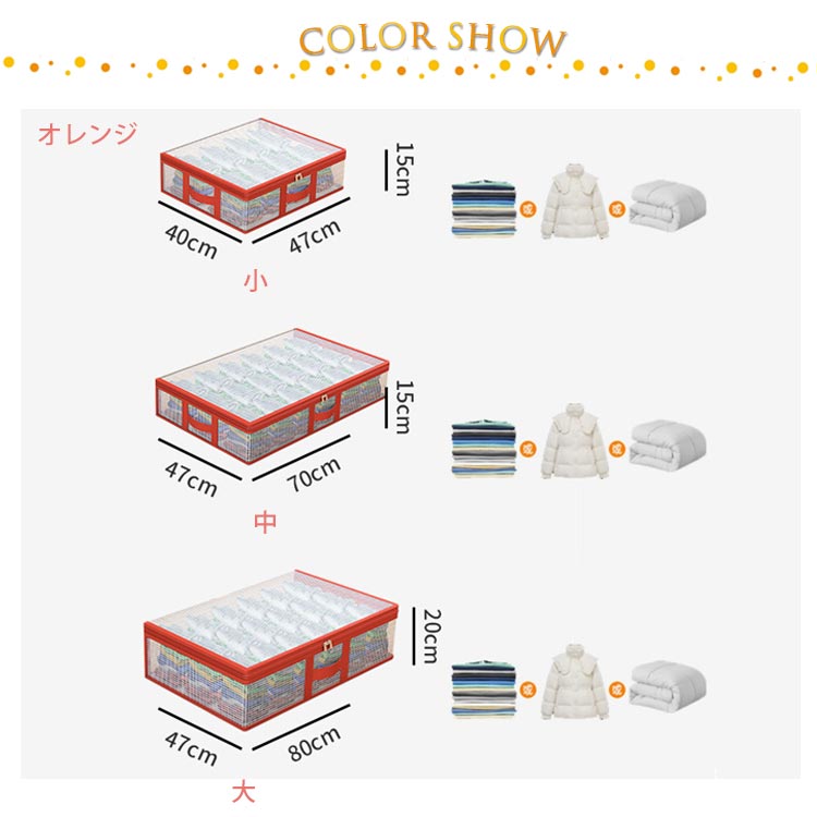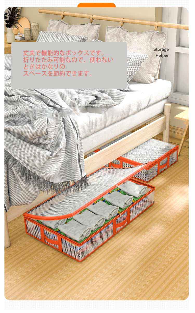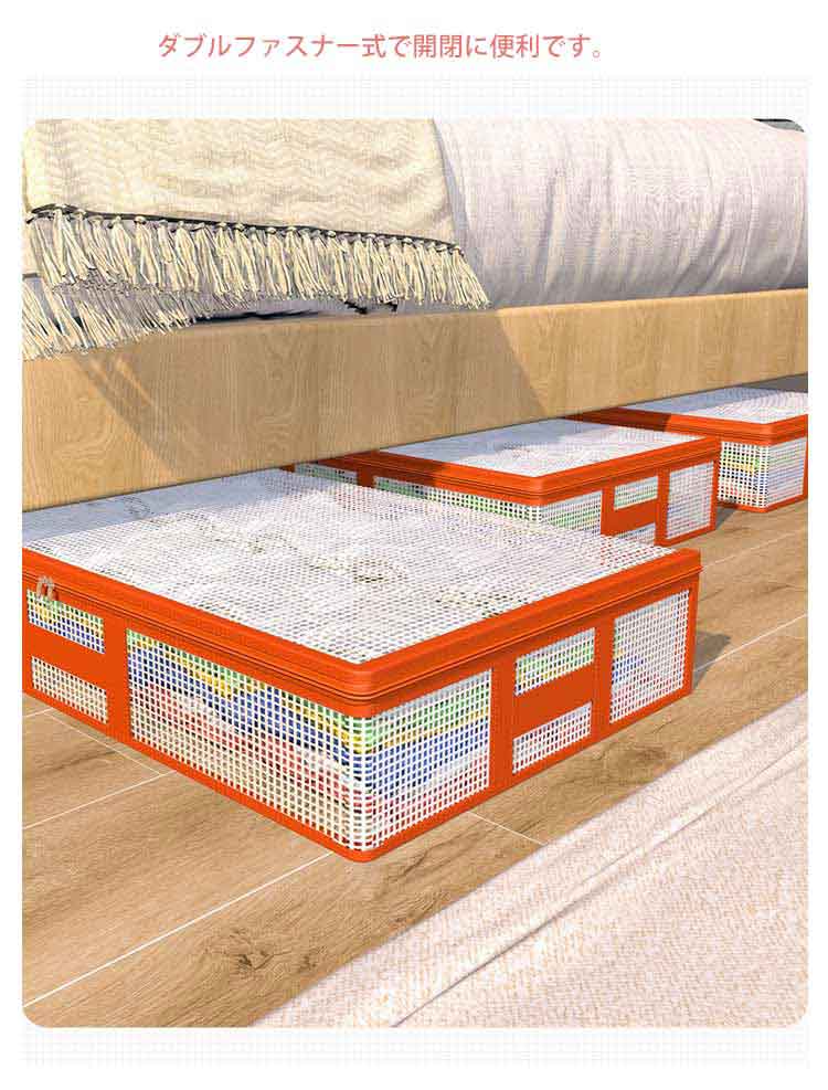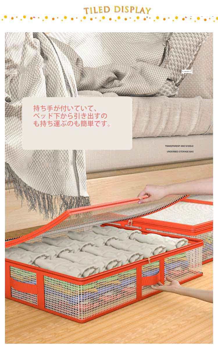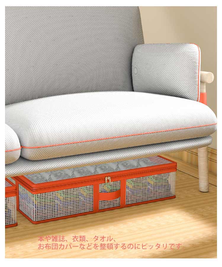 | 中身を確認できるタイプ、色んな隙間に置けるの薄型収納ボックス。 持ち手が付いていて、ベッド下から引き出すのも持ち運ぶのも簡単です。 丈夫で機能的なボックスです。 折りたたみ可能なので、使わないときはかなりのスペースを節約できます。 ダブルファスナー式で開閉に便利です。 床に置いても、クローゼットに入れても、本棚に乗せても、机に乗せてもオッケー! 様々な場所で使えます。 本や雑誌、衣類、タオル、お布団カバーなどを整頓するのにピッタリです。 | |