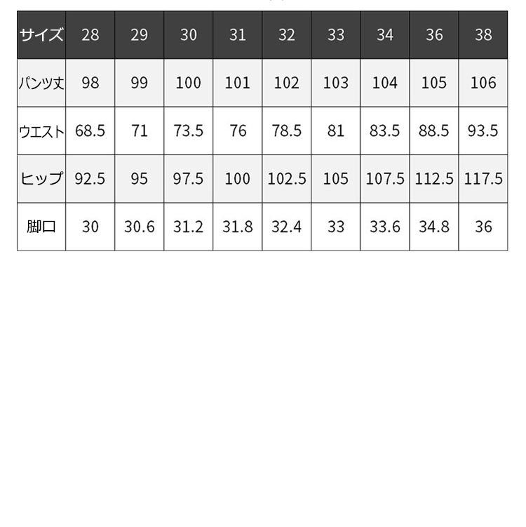 | サイズ | 28 29 30 31 32 33 34 36 38 |