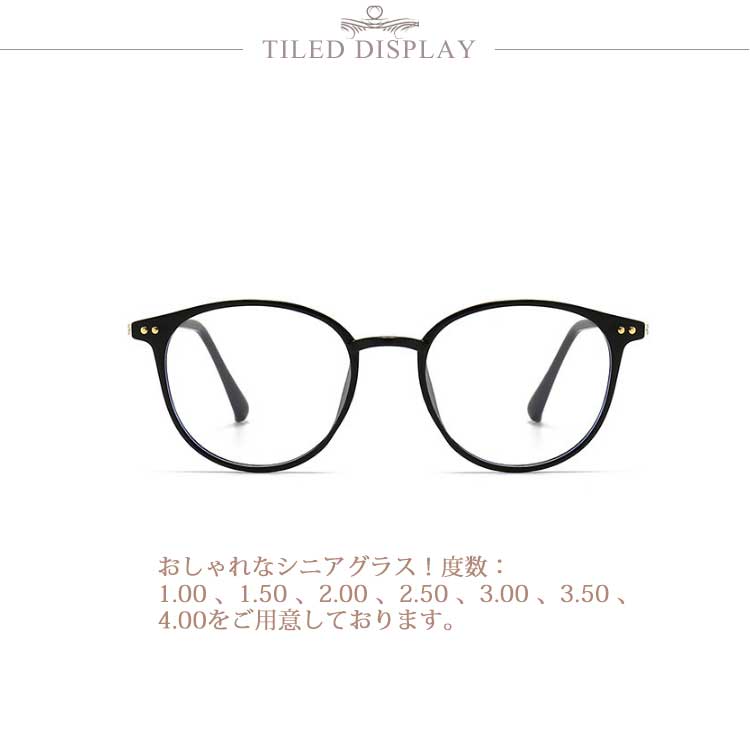 | 遠近両用メガネ 【ブルーライトカット】 【優しい掛け心地】 【掛けやすい】 おしゃれなシニアグラス!度数:1.00 、1.50 、2.00 、2.50 、3.00 、3.50 、4.00をご用意しております。 目に優しいブルーライトカットを採用。パソコンやスマートフォンを長時間使用するにも最適。また傷が付きにくいハードコーティング仕様。 とは、独自設計の累進多焦点レンズを搭載するシニアグラス(老眼鏡)です。レンズの中心からやや下部、主に手元を見る時の視点の位置に最も度数の強いレンズを配置し、外側に向かい同心円状に度数が滑らかに減少していく累進設計を採用。自然な焦点(ピント)移動を可能にしました。さらに複数の度数を持った多焦点レンズを採用することにより、このひとつで幅広い老眼の方にクリアな視界と広い視野を提供してくれる優れもののシニアグラスです。 超軽量設計なので、長時間かけても疲れません!新聞紙や本、カタログ等スマホやPCを閲覧する際に何かと便利なので1本は持っていたい優れものグラスです! | |