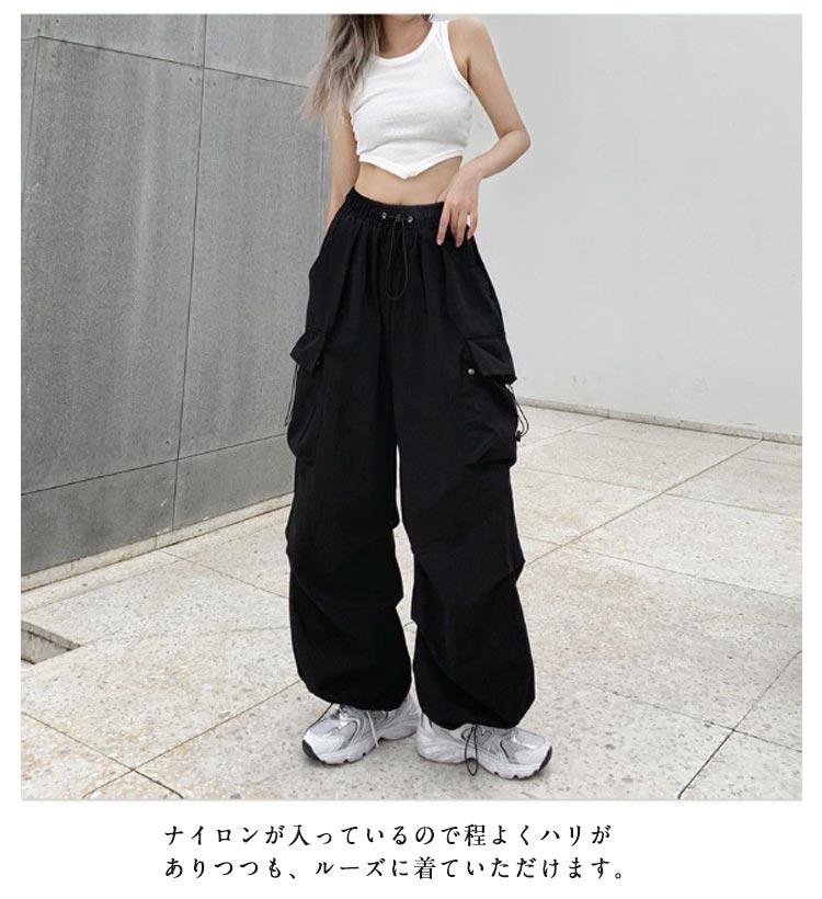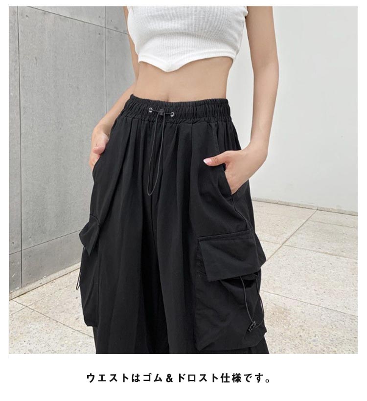 大きめフラップポケットがインパクト大!シルエット変化も楽しめるゆったりカーゴパンツメンズライクなミリタリーカーゴを、ワイドなバルーンシルエットで今っぽくアップデートしました。ウエストはゴム&ドロスト仕様です。裾も絞れるドロスト仕様になっていますが、結びをしないでもストレートシルエットの今年っぽいラインです。ナイロンが入っているので程よくハリがありつつも、ルーズに着ていただけます。ダンスパンツとしても◎普段着のカジュアルパンツとしても使えます。