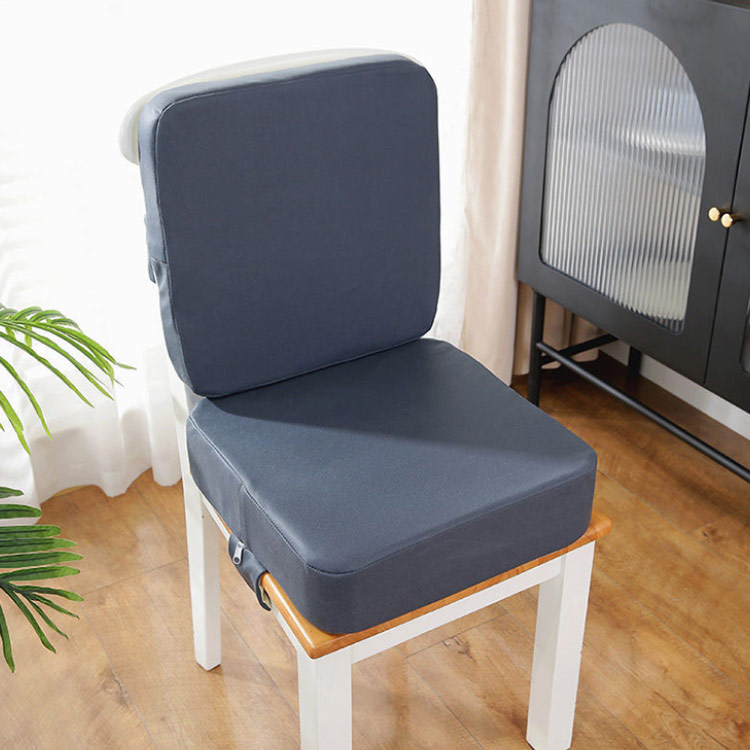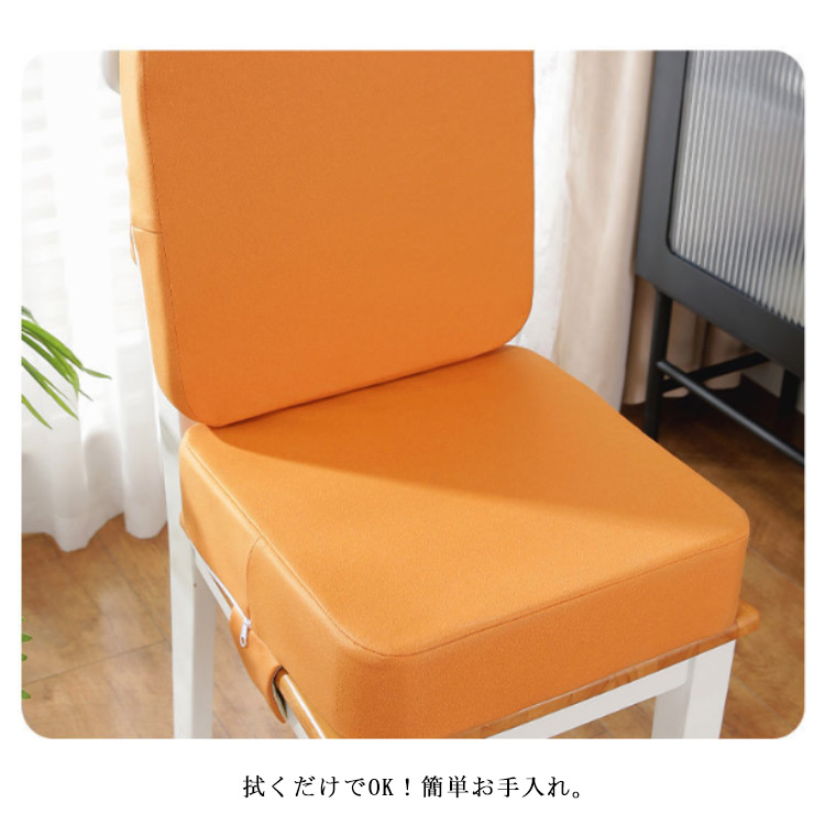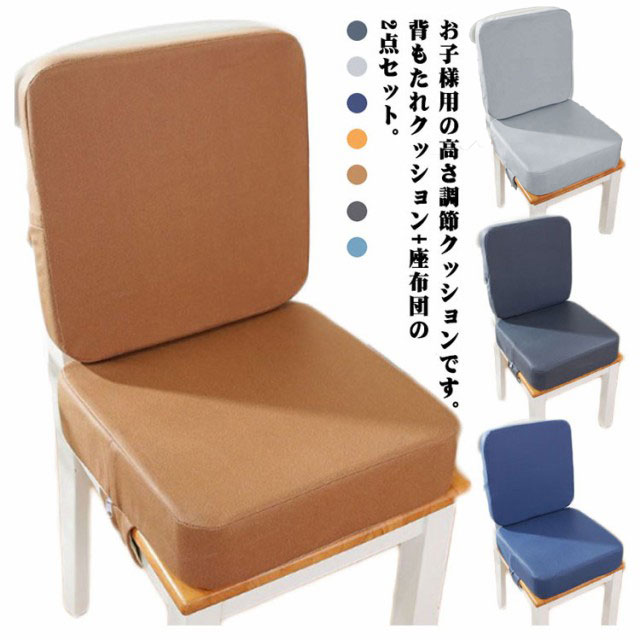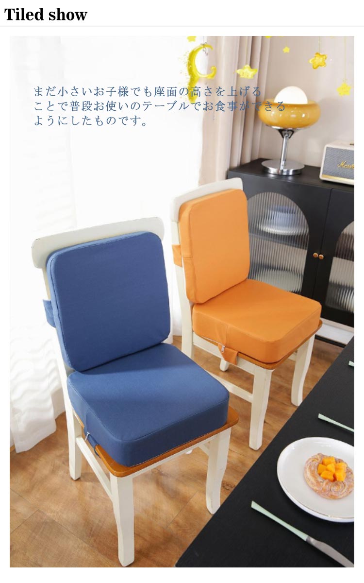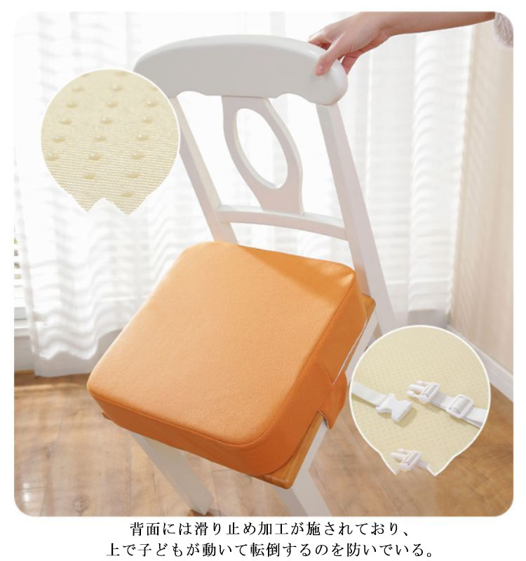 お子様用の高さ調節クッションです。背もたれクッション+座布団の2点セット。まだ小さいお子様でも座面の高さを上げることで普段お使いのテーブルでお食事ができるようにしたものです。お子様が自分で食事するために設計された椅子用シートクッションだけではなく、外出の際に座布団としてもご使用もお勧めます。取り付けはとにかく簡単な方がいいから、椅子への設置はバックルベルトで止めるだけ、椅子の大きさに合わせてベルトの長さをキュッと調節するだけ、出来上がり。背面には滑り止め加工が施されており、上で子どもが動いて転倒するのを防いでいる。拭くだけでOK!簡単お手入れ。