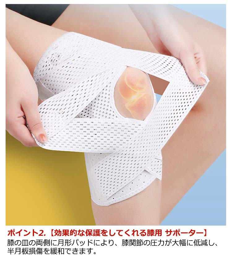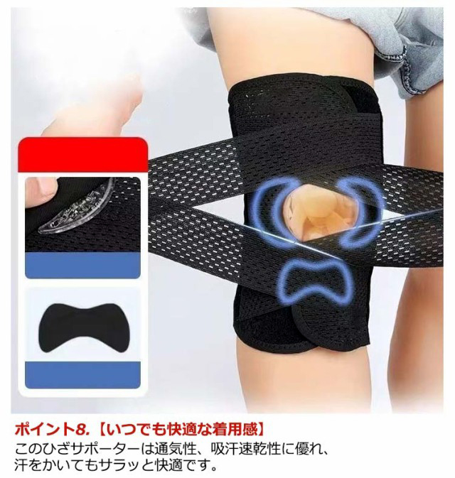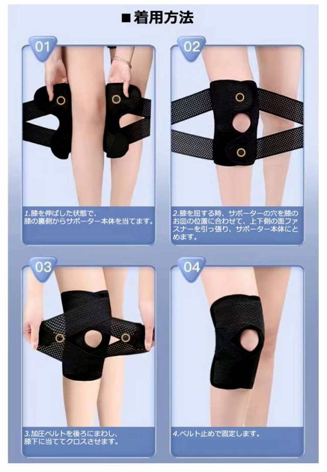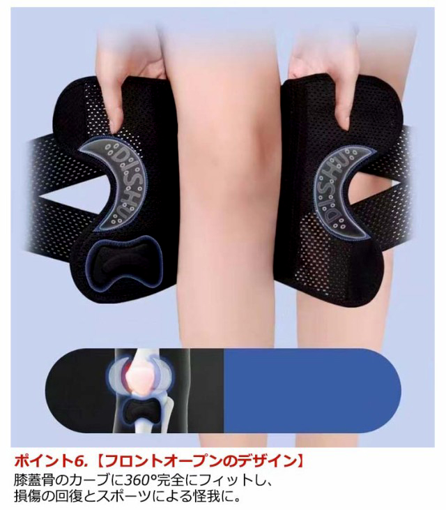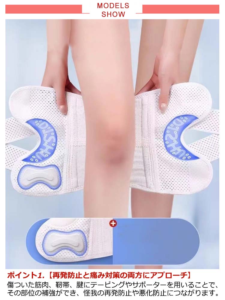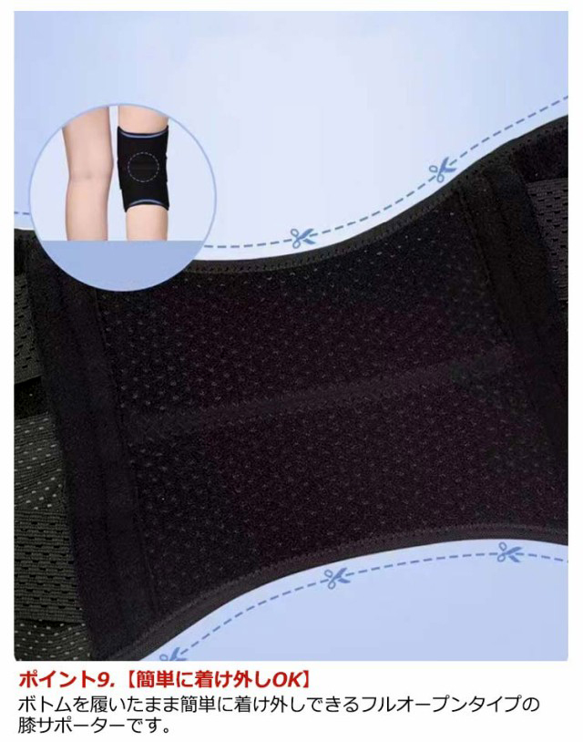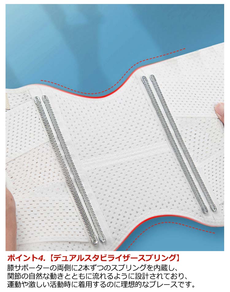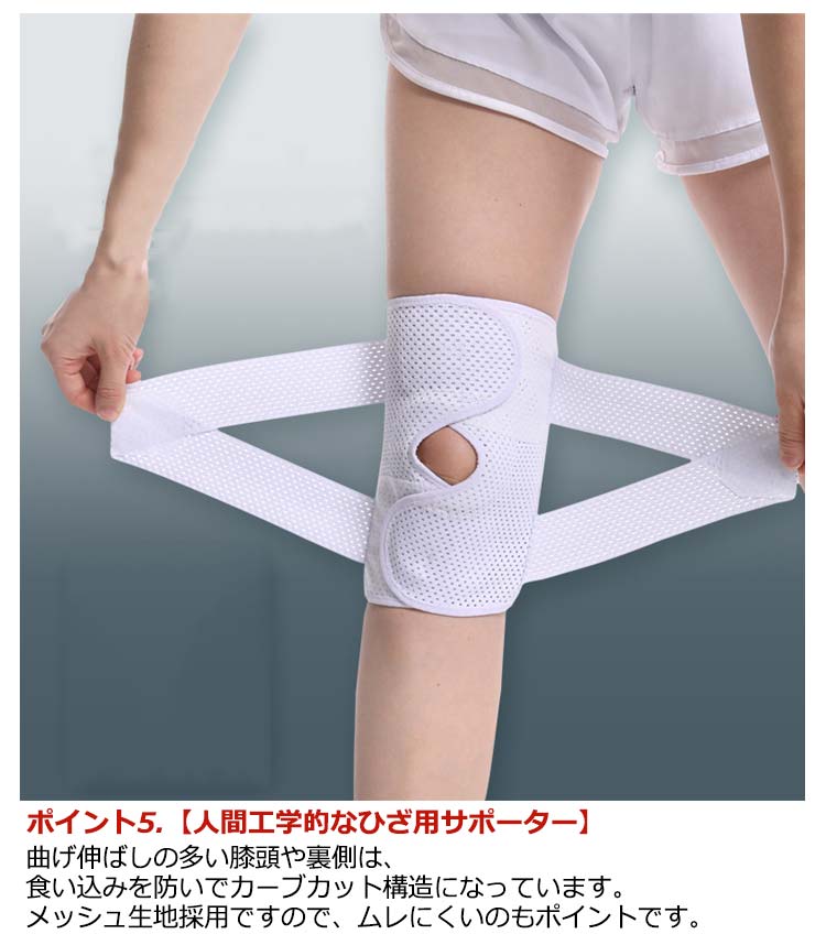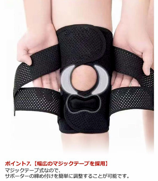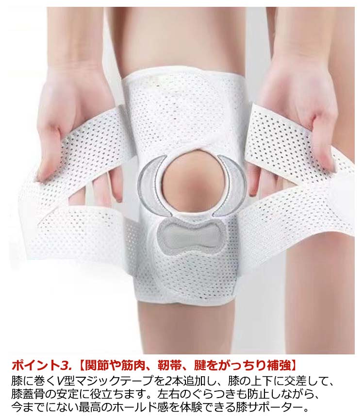 ポイント1.【再発防止と痛み対策の両方にアプローチ】傷ついた筋肉、靭帯、腱にテーピングやサポーターを用いることで、その部位の補強ができ、怪我の再発防止や悪化防止につながります。ポイント2.【効果的な保護をしてくれる膝用 サポーター】膝の皿の両側に月形パッドにより、膝関節の圧力が大幅に低減し、半月板損傷を緩和できます。ポイント3.【関節や筋肉、靭帯、腱をがっちり補強】膝に巻くV型マジックテープを2本追加し、膝の上下に交差して、膝蓋骨の安定に役立ちます。左右のぐらつきも防止しながら、今までにない最高のホールド感を体験できる膝サポーター。ポイント4.【デュアルスタビライザースプリング】膝サポーターの両側に2本ずつのスプリングを内蔵し、関節の自然な動きとともに流れるように設計されており、運動や激しい活動時に着用するのに理想的なブレースです。ポイント5.【人間工学的なひざ用サポーター】曲げ伸ばしの多い膝頭や裏側は、食い込みを防いでカーブカット構造になっています。メッシュ生地採用ですので、ムレにくいのもポイントです。ポイント6.【フロントオープンのデザイン】膝蓋骨のカーブに360°完全にフィットし、損傷の回復とスポーツによる怪我に。ポイント7.【幅広のマジックテープを採用】マジックテープ式なので、サポーターの締め付けを簡単に調整することが可能です。ポイント8.【いつでも快適な着用感】このひざサポーターは通気性、吸汗速乾性に優れ、汗をかいてもサラッと快適です。ポイント9.【簡単に着け外しOK】ボトムを履いたまま簡単に着け外しできるフルオープンタイプの膝サポーターです。ポイント10.【様々なシーンに最適】ランニング、ジョギング、ジム、ウェイトリフティング、バスケットボールなど、数多くのスポーツで幅広く使用されている膝用サポーターです。また、手術後の回復のために運動する方や、長時間立ったり歩いたりする方にもお勧めです。日常生活で使用すると、24時間一日中サポートが受けられます。サイズの選び方普通に立った状態でメジャーでヒザのお皿の中心から、10cm上の太ももの太さに合わせ計測■着用方法1.膝を伸ばした状態で、膝の裏側からサポーター本体を当てます。2.膝を屈する時、サポーターの穴を膝のお皿の位置に合わせて、上下側の面フ