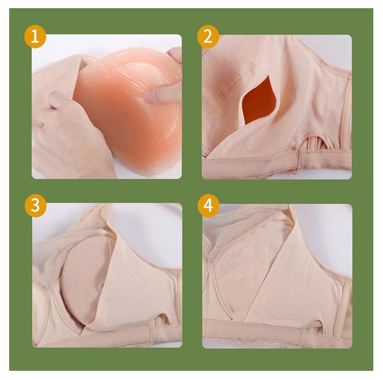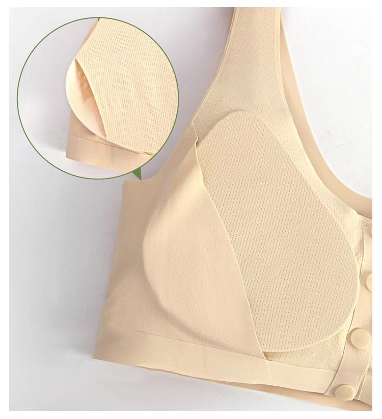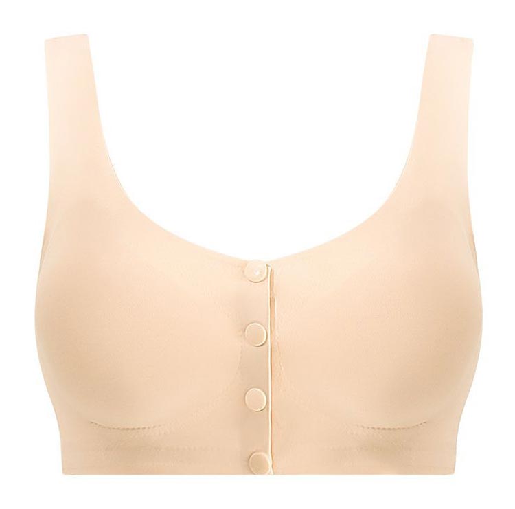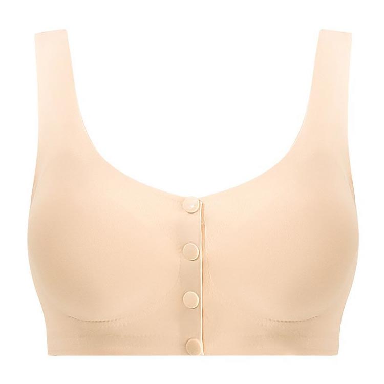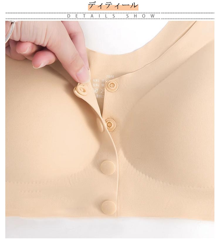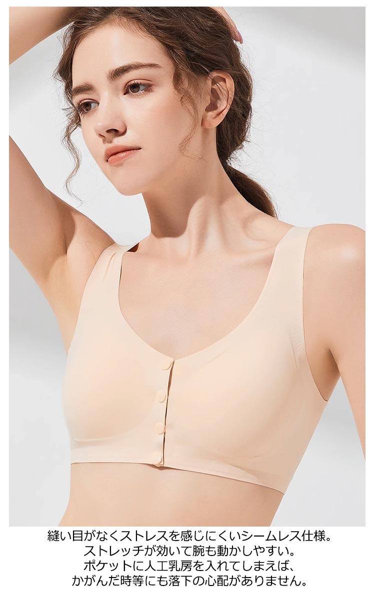 前開き乳がんブラ 乳がん用パット対応!乳がん手術直後の腕が上がらない時や診察時にも、前開きスナップで着脱がらくちん。ポケットにパッドを入れられるから退院後もずっと活躍できる乳癌用ブラジャーです。 縫い目がなくストレスを感じにくいシームレス仕様。ストレッチが効いて腕も動かしやすい。ポケットに人工乳房を入れてしまえば、かがんだ時等にも落下の心配がありません。M~3XLまで幅広い体型の方に対応。 伸縮性がございますので大きめのパッドも入ります。アンダーのサイズでお選び下さい ホールド感がほとんどありませんので、術後すぐや、自宅でゆったりする時、ナイトブラ等におすすめ。