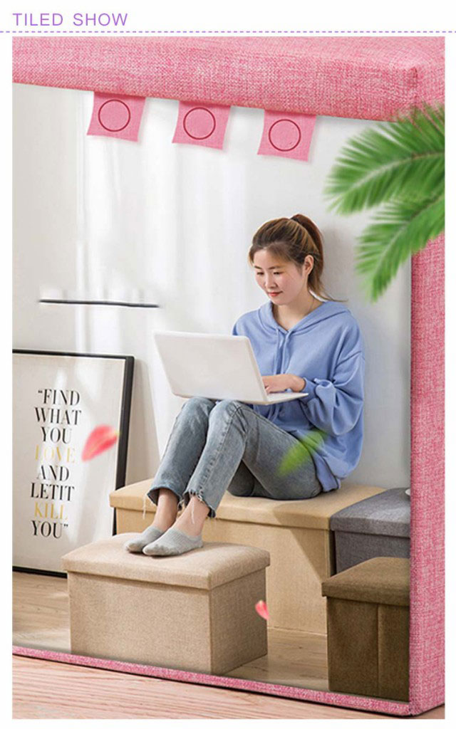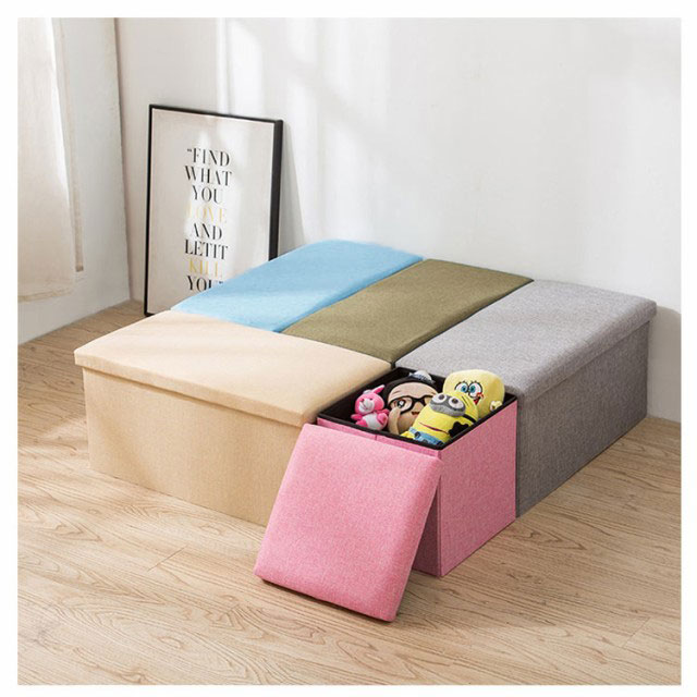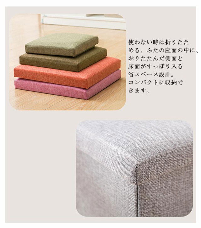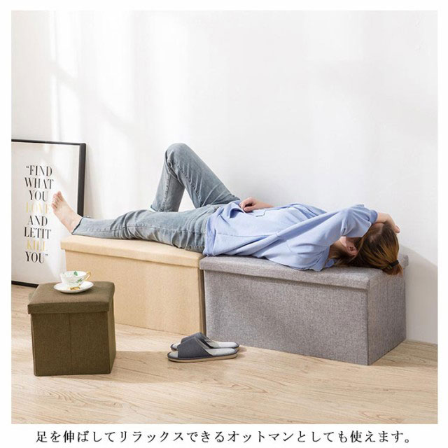 マルチに使える収納スツール。収納力抜群で小物の収納、おもちゃ入れや季節物の収納に活躍します。収納ボックスとしてはもちろんイスとして使用も可能!座り心地の良いクッションの座面!ほどよいクッション性で座り心地GOOD!急な来客のちょとしたイスとしても利用できてとっても便利です。フタを開ければたっぷりの収納スペース!足を伸ばしてリラックスできるオットマンとしても使えます。使わない時は折りたためる。ふたの座面の中に、おりたたんだ側面と床面がすっぽり入る省スペース設計。コンパクトに収納できます。