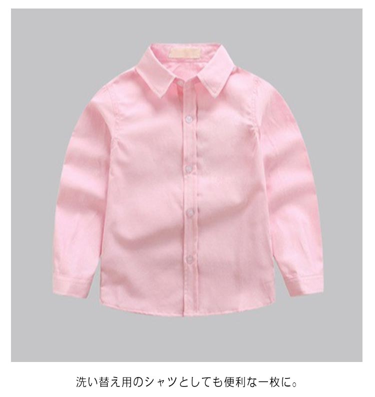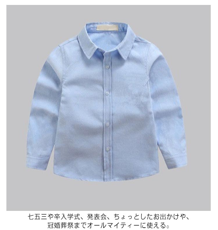 どんなシーンにも対応できる長袖のシャツ。上品かつスタイリッシュなシルエットです♪七五三や卒入学式、発表会、ちょっとしたお出かけや、冠婚葬祭までオールマイティーに使える。洗い替え用のシャツとしても便利な一枚に。形態安定、防シワ加工のシャツはお手入れ簡単です。さらりとした綿生地は吸汗性・通気性・肌触りよく着心地も快適。