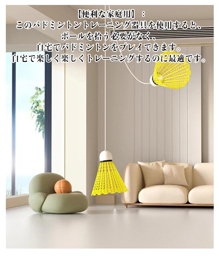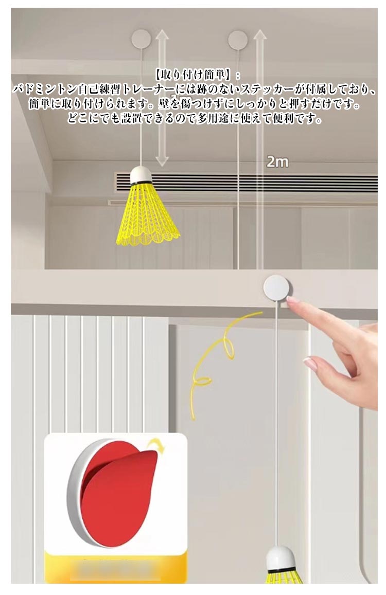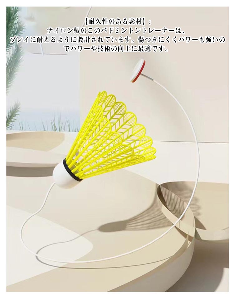 【便利な家庭用】:このバドミントントレーニング器具を使用すると、ボールを拾う必要がなく、自宅でバドミントンをプレイできます。自宅で楽しく楽しくトレーニングするのに最適です。【耐久性のある素材】: ナイロン製のこのバドミントントレーナーは、プレイに耐えるように設計されています。傷つきにくくパワーも強いのでパワーや技術の向上に最適です。【取り付け簡単】: バドミントン自己練習トレーナーには跡のないステッカーが付属しており、簡単に取り付けられます。壁を傷つけずにしっかりと押すだけです。どこにでも設置できるので多用途に使えて便利です。