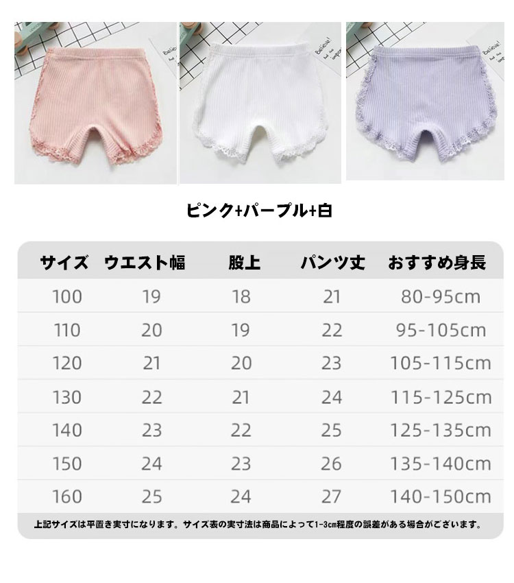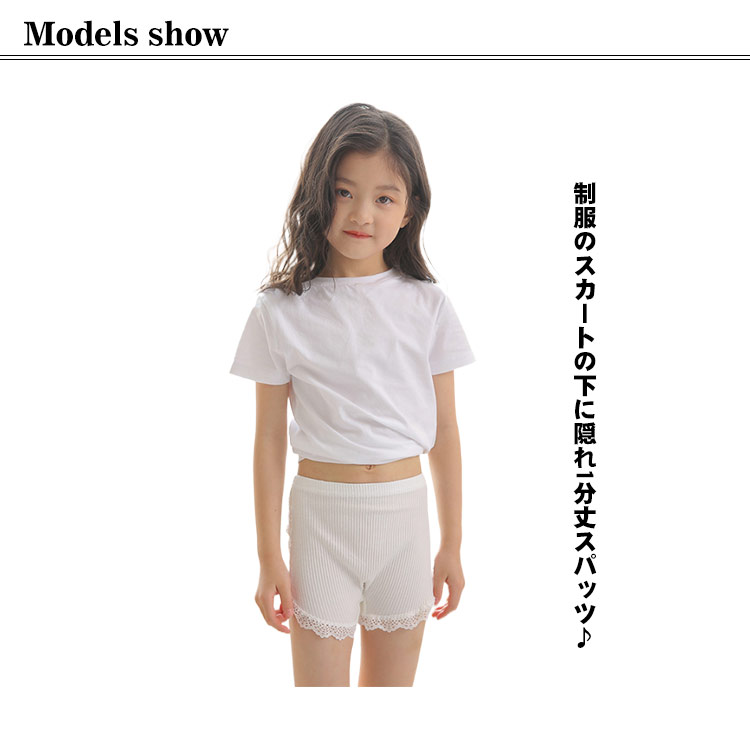| 【3枚組】【100~160cm】【1分丈スパッツ】 制服のスカートの下に隠れ1分丈スパッツ? 何回洗濯しても色落ち、型崩れない!窮屈さやムレはなく、とっても快適な履き心地~ レース裾のデザインで、ガーリー度たっぷり! 良質なコットン素材で、柔らかくて通気性があり、締め付け感もなく、着心地抜群! 通園?通学用のインナーとしておすすめです★ | |