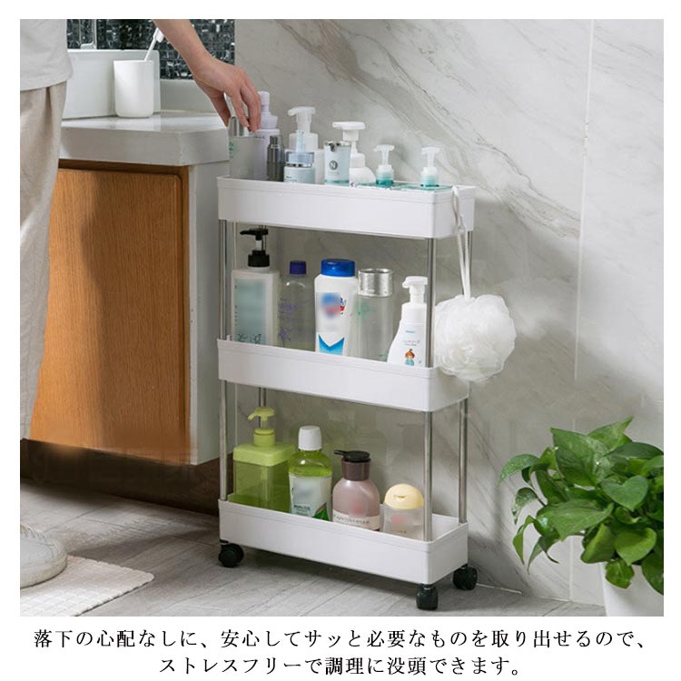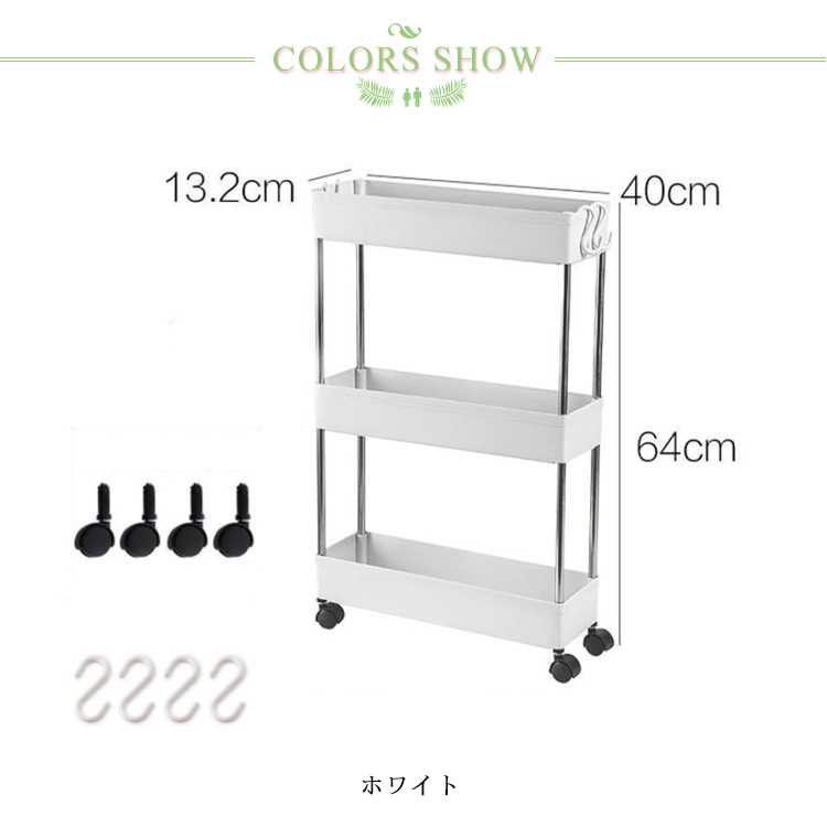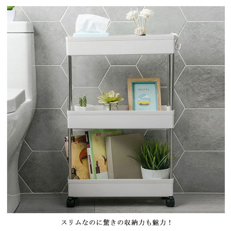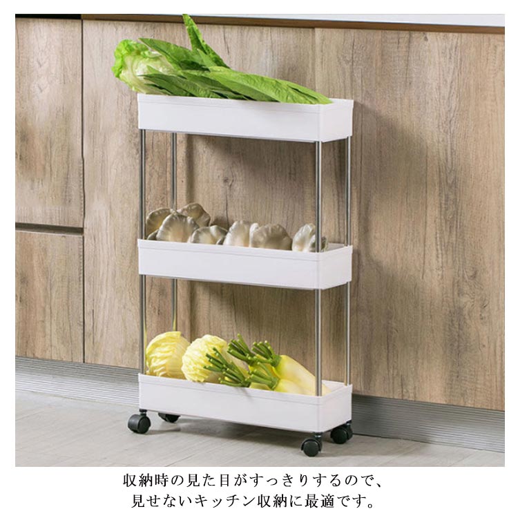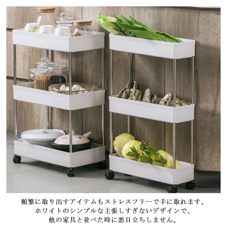 | 収納時の見た目がすっきりする! ちょっとした隙間が統一感ある収納スペースに早変わり! 幅わずか13cm!収納はできるだけ目立たないよう、バレないようにしたいもの。 スリムなのに驚きの収納力も魅力! 収納時の見た目がすっきりするので、見せないキッチン収納に最適です。 頻繁に取り出すアイテムもストレスフリーで手に取れます。 落下の心配なしに、安心してサッと必要なものを取り出せるので、ストレスフリーで調理に没頭できます。 ホワイトのシンプルな主張しすぎないデザインで、他の家具と並べた時に悪目立ちしません。 キッチン?リビング?クローゼット収納?納戸の収納棚?玄関収納?子供部屋など、色々なシーンで使える便利なスリムトローリーです。 | |