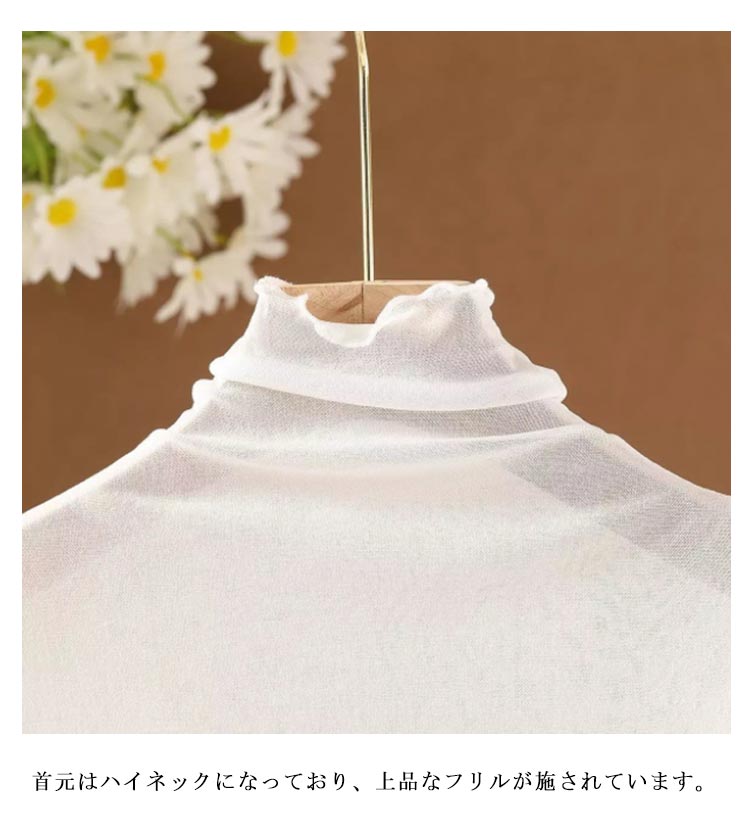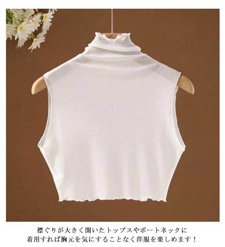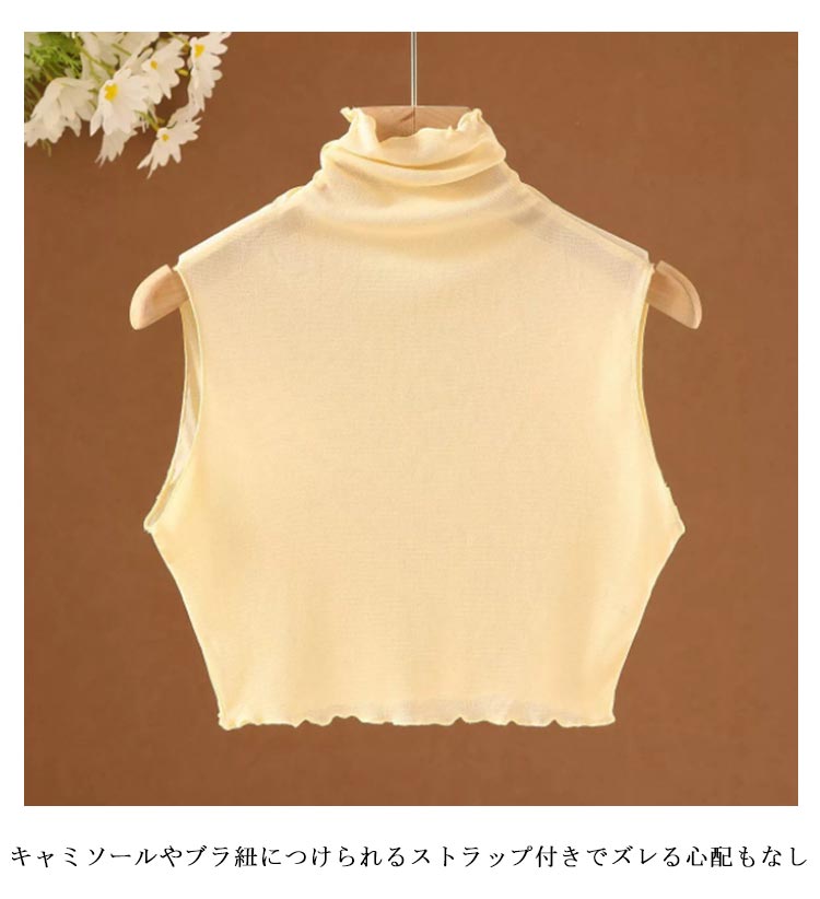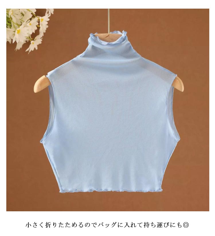 簡単にレイヤードスタイルが完成するシアー付け襟です。首元はハイネックになっており、上品なフリルが施されています。伸縮する肌触りの柔らかな薄手のカットソーです。襟ぐりが大きく開いたトップスやボートネックに着用すれば胸元を気にすることなく洋服を楽しめます!首元の冷えやUV対策にも!キャミソールやブラ紐につけられるストラップ付きでズレる心配もなし、小さく折りたためるのでバッグに入れて持ち運びにも◎