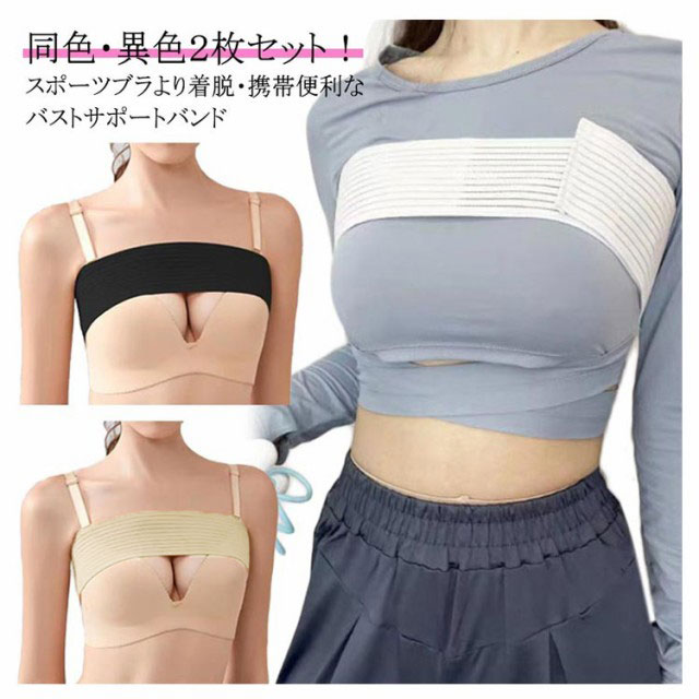同色・異色2枚セット!スポーツブラより着脱・携帯便利なバストサポートバンド【着脱しやすい】伸縮性に優れていて長さがあり、巻いてマジックテープで止めるだけなのでどんなバストや体型でも着脱が簡単です。【バストの型崩れ予防】胸を根元から包み込んで固定することで胸の揺れを防ぎ、胸の変形を防ぎます。【ノンワイヤーで快適】ノンワイヤーなのでフィット感がよく、揺れによるバストの痛み、装着時のストレスを軽減します。【軽量でコンパクト】超軽量なので旅先や出張時にも携帯しやすい。【シーンを選ばず使える】ヨガ、スポーツ、ウォーキング時などあらゆるシーンでアクティブのアイテムです。