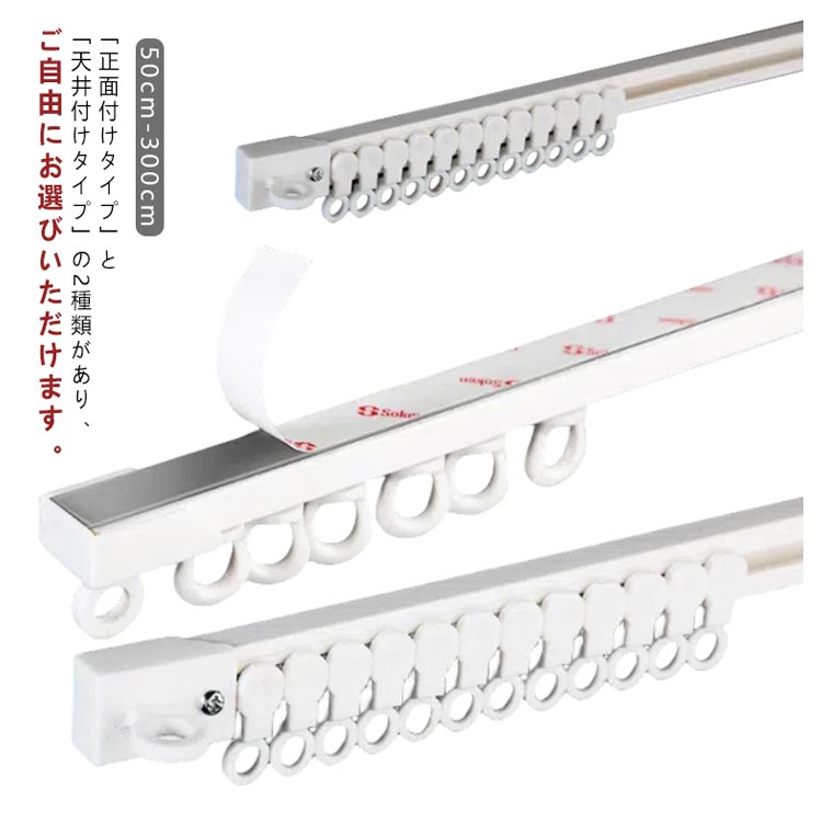 カーテンレール 正面付け 天井付け 長さ調整 調節可能 50cm-300cm 滑車18個 カット自在 粘着 ランナー 両面テープ 粘着式 取付簡単 頑丈 静音性 耐荷重5kg 貼り付け キャップ 間仕切り ネジ打ち不要 開閉簡単 ミニサイズ シンプル