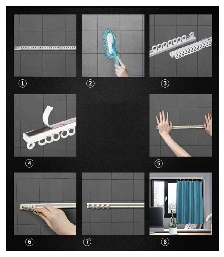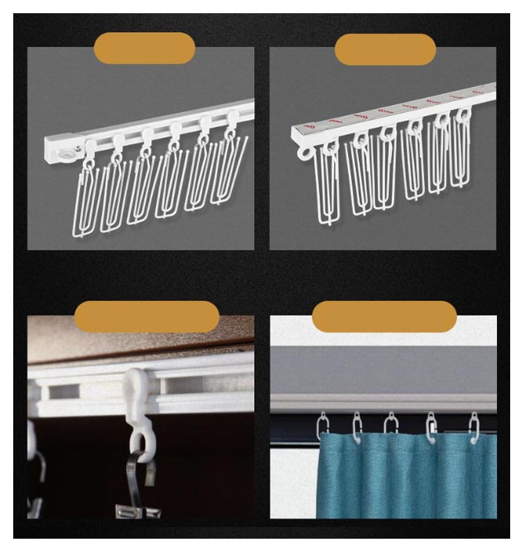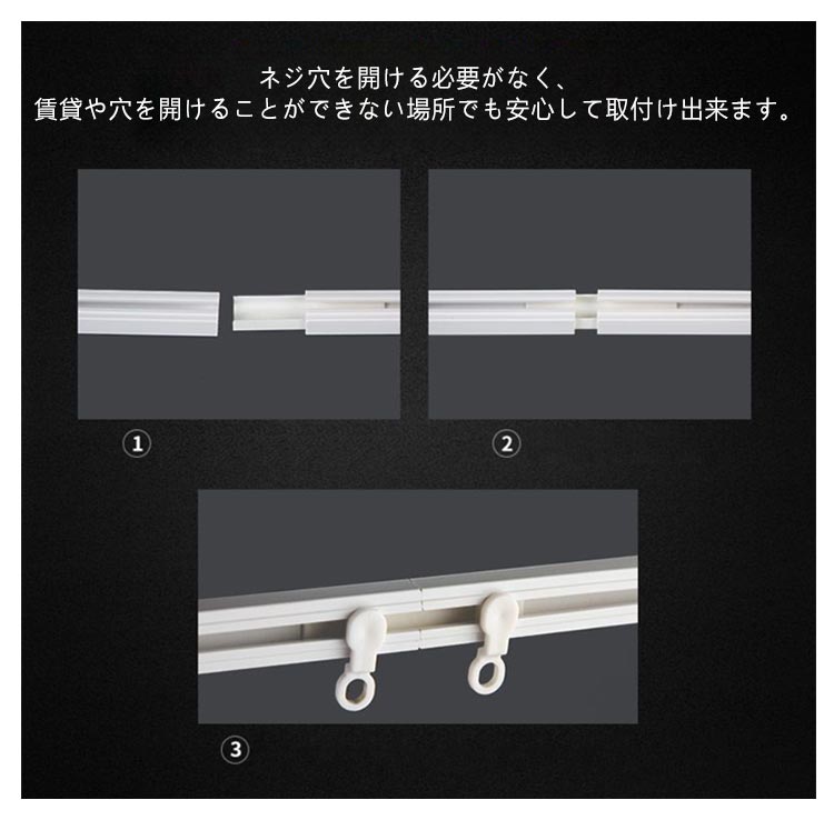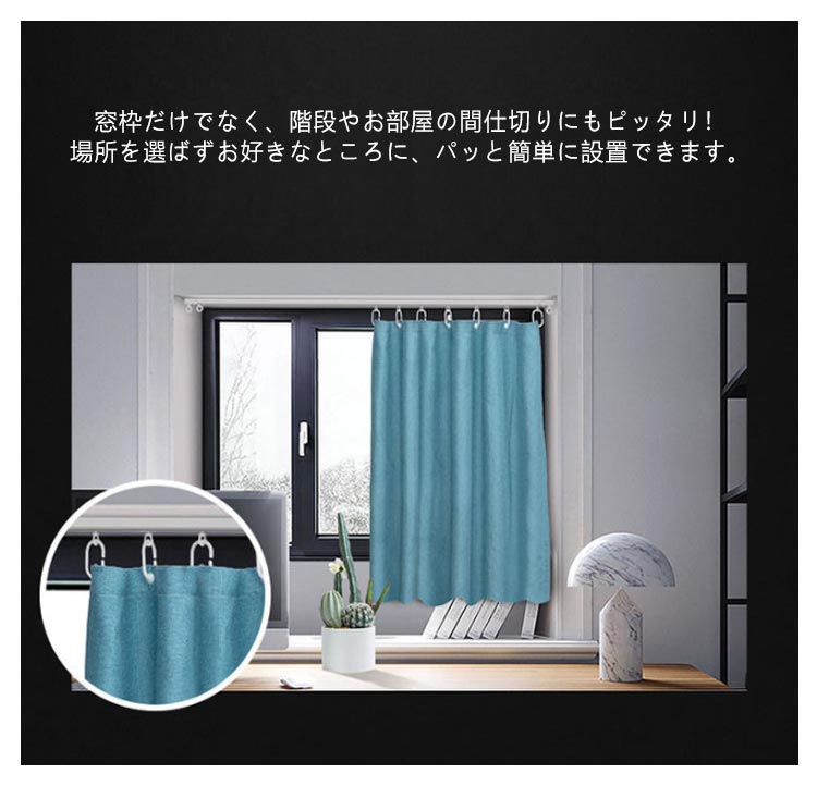 「正面付けタイプ」と「天井付けタイプ」の2種類があり、ご自由にお選びいただけます。ネジ打ち不要で、両面テープのフイルムを剥がすだけで簡単に壁面に取り付けます。初心者でも簡単に設置できます。一本の長さは50cmで、6本入りセットになります。自由にカートすることもでき、お好みの長さに調節できます。カーテンを開閉する際の音が小さいです。開け閉めしやすく居心地のいい空間になります。ネジ穴を開ける必要がなく、賃貸や穴を開けることができない場所でも安心して取付け出来ます。窓枠だけでなく、階段やお部屋の間仕切りにもピッタリ!場所を選ばずお好きなところに、パッと簡単に設置できます。シンプル、スタイリッシュデザインで、オシャレな印象を演出します。二段ベッド、出窓、小窓、間の仕切り、本棚等にお使いいただけます。