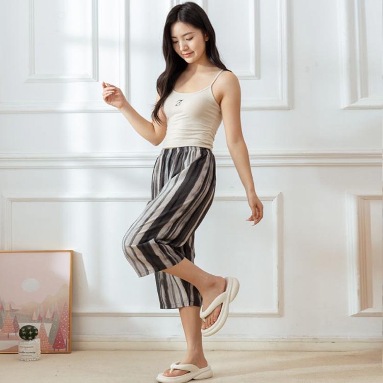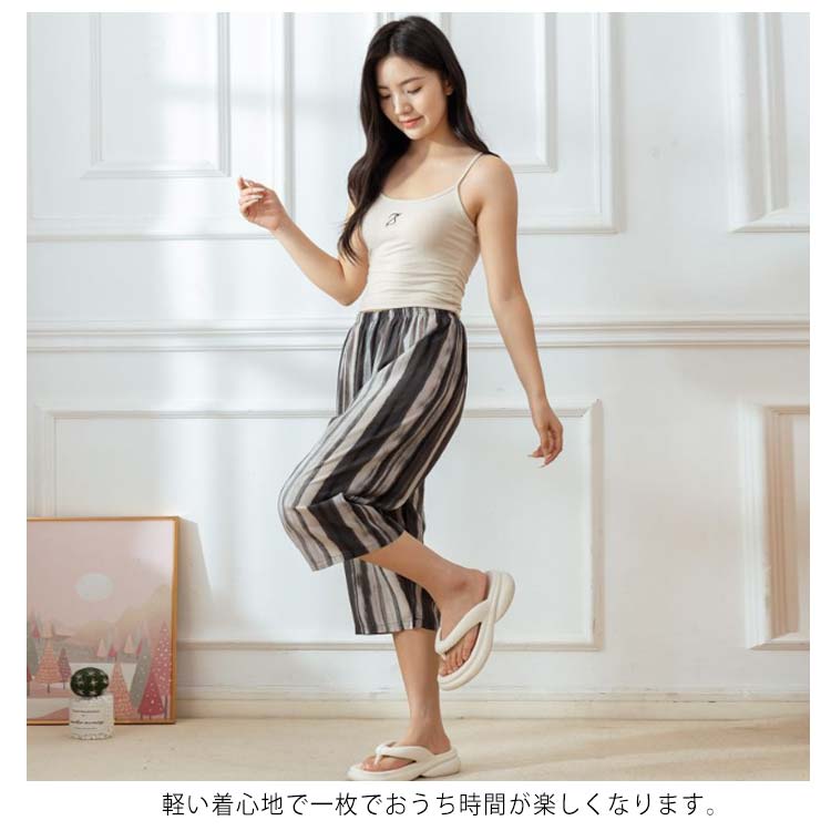 夏のお風呂上がりのルームパンツです。肌に優しくて暑くない素材で、通気性に優れて、乾きも早いので、敏感肌にも優しいです。着るだけで思わず癒されるソフト感、お家でのリラックスタイムをかわいく快適に過ごせます。締め付け感がなくてさらりとした着心地が癖になる、春夏の部屋着としてぴったり。軽い着心地で一枚でおうち時間が楽しくなります。
