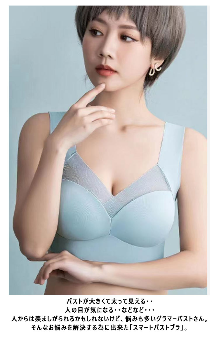 バストが大きくて太って見える・・人の目が気になる・・などなど・・・人からは羨ましがられるかもしれないけど、悩みも多いグラマーバストさん。そんなお悩みを解決する為に出来た「スマートバストブラ」。大きな胸を小さく見せて、着痩せしてくれる理想的なブラです!ノンワイヤーでストレスフリーなのにしっかりハミ肉をキャッチ!谷間を隠すデザインなので胸元のチラ見えOK。まるでキャミソールを着ているようなかわいらしさ。