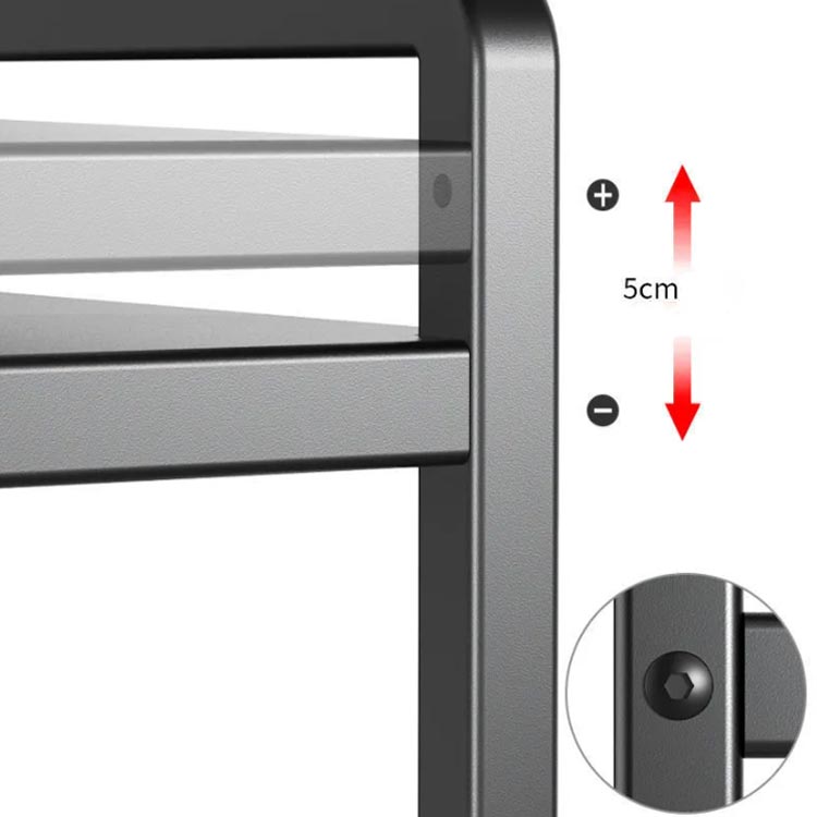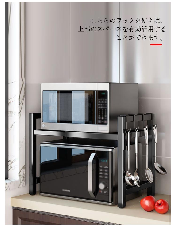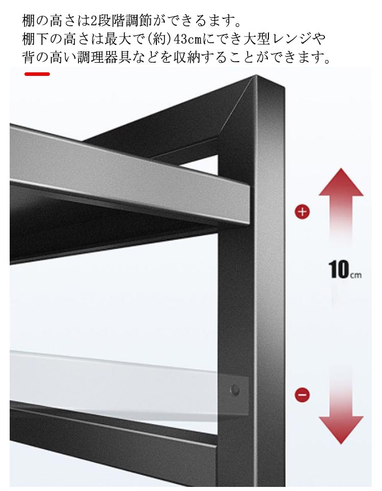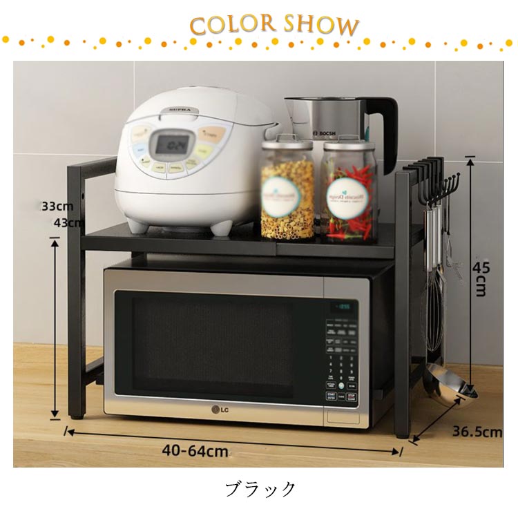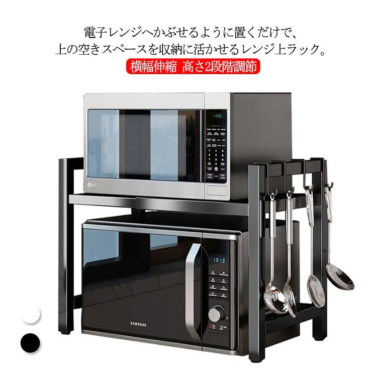 電子レンジへかぶせるように置くだけで、上の空きスペースを収納に活かせるレンジ上ラック。横幅伸縮 高さ2段階調節こちらのラックを使えば、上部のスペースを有効活用することができます。耐荷重は約75kgなので、キッチン家電や小物、調味料など置ける丈夫さ。幅は約40~64cmの間で伸縮でき、レンジの大きさやスペースに合わせて幅を調節できます。棚の高さは2段階調節ができるます。棚下の高さは最大で(約)43cmにでき大型レンジや背の高い調理器具などを収納することができます。フレームはスチール製で安定感があります。サイドにフックが付いて、お玉などのキッチンツールなどを掛けるのに便利シンプルなデザインだから圧迫感がありません。