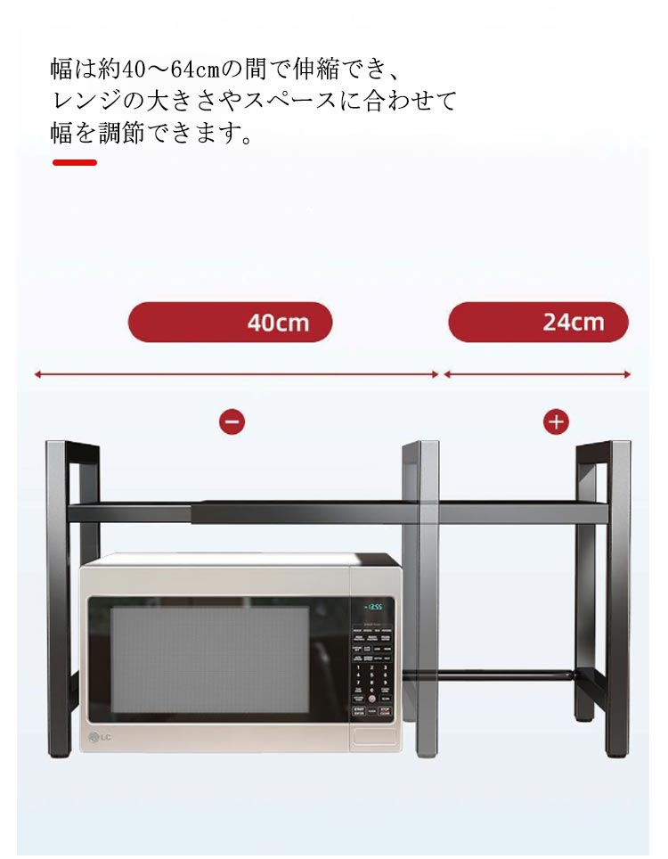 レンジ上ラック 伸縮 幅40〜64cm レンジ上 ラック キッチンラック レンジ台 レンジ棚 1段 キッチン収納 大型レンジ対応 電子レンジ台 トースター 炊飯器 ラック レンジ置台 カウンター上 収納 卓上 棚 調味料ラック シンプル おしゃれ 北欧 キッチン用品 伸縮レンジラック