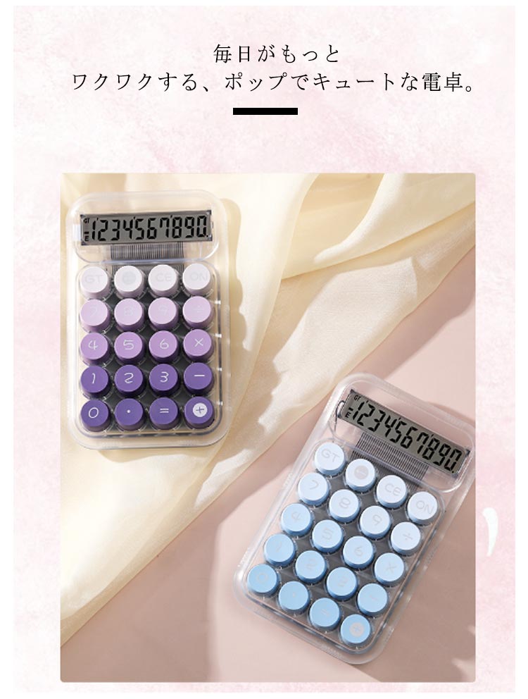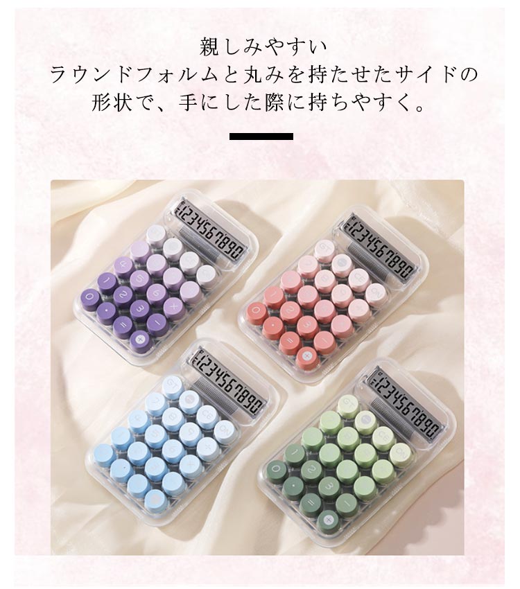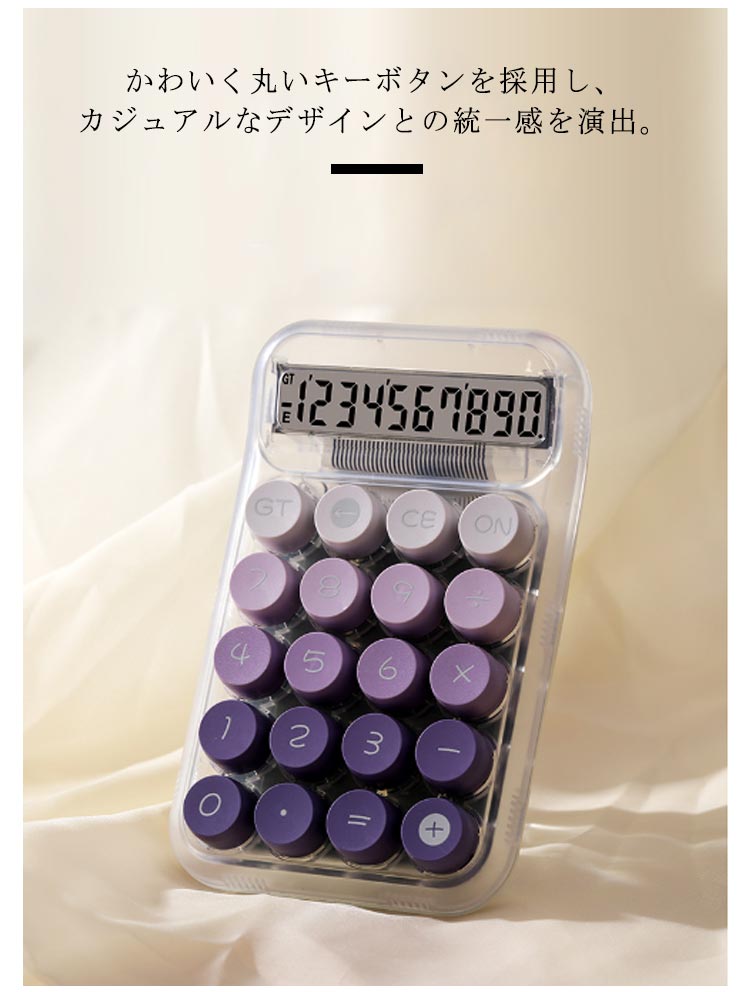 | かわいく丸いキーボタンを採用し、カジュアルなデザインとの統一感を演出。 親しみやすいラウンドフォルムと丸みを持たせたサイドの形状で、手にした際に持ちやすく。 毎日がもっとワクワクする、ポップでキュートな電卓。 そのままデスクに置いておいてもインテリアになるおしゃれなデザインです。 | |