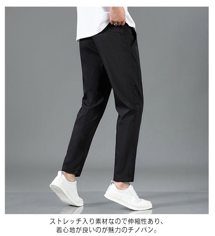 【M-5XL】【接触冷感・速乾・ストレッチ】カジュアルからキレイめまで幅広くコーデに取り入れられるイージーチノパンが登場!ストレッチ入り素材なので伸縮性あり、着心地が良いのが魅力のチノパン。接触冷感加工施しているので涼しく、真夏の暑さの中でも快適に着こなせるのが嬉しいポイント!シンプルなデザインがスタイリッシュな雰囲気でコーデを昇華させてくれます。トレンドでもあるアンクル丈に、程良いテーパードシルエットがスッキリとした見た目と快適な履き心地を両立させるおススメボトムスです。