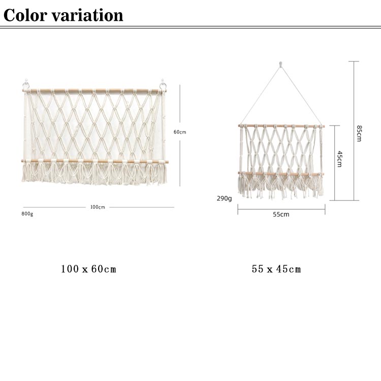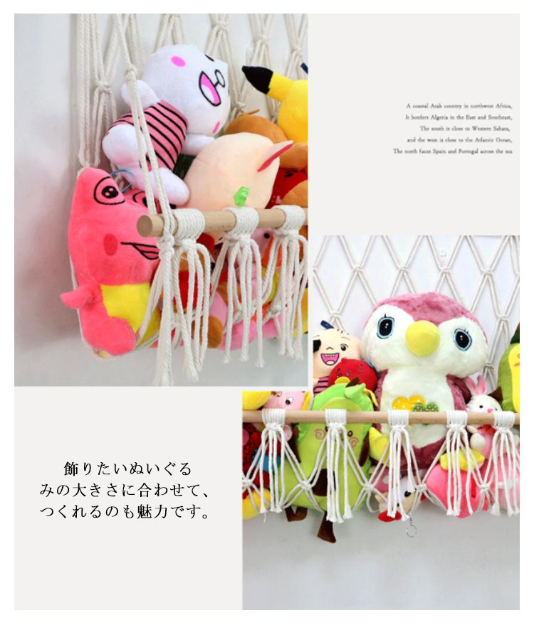 | 収納に困っているぬいぐるみをきれいに収納することができるマクラメハンモック。 壁掛けもでき、浮かせる収納もでき、様々な場所で設置できます。 ぬいぐるみ収納をしながら飾ることができるため、一石二鳥です。 タッセルをつけると、よりインテリア感の強い、おしゃれな印象に。 飾りたいぬいぐるみの大きさに合わせて、つくれるのも魅力です。 | |