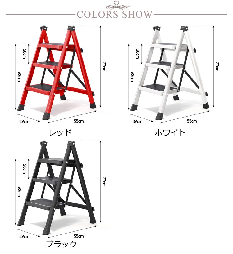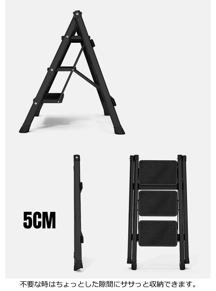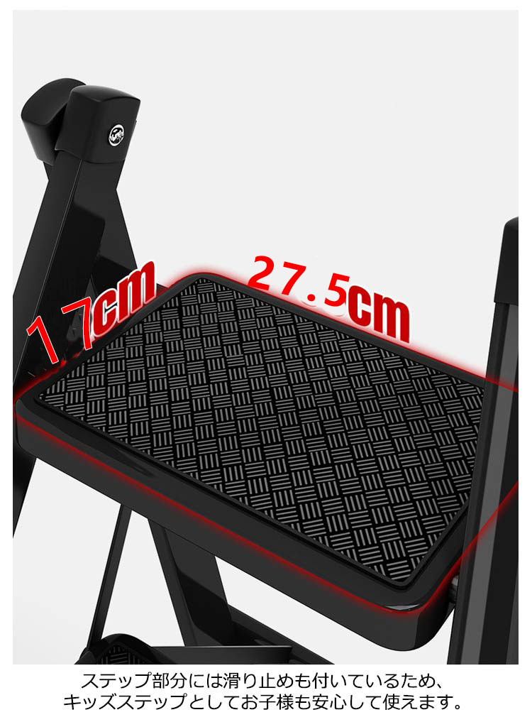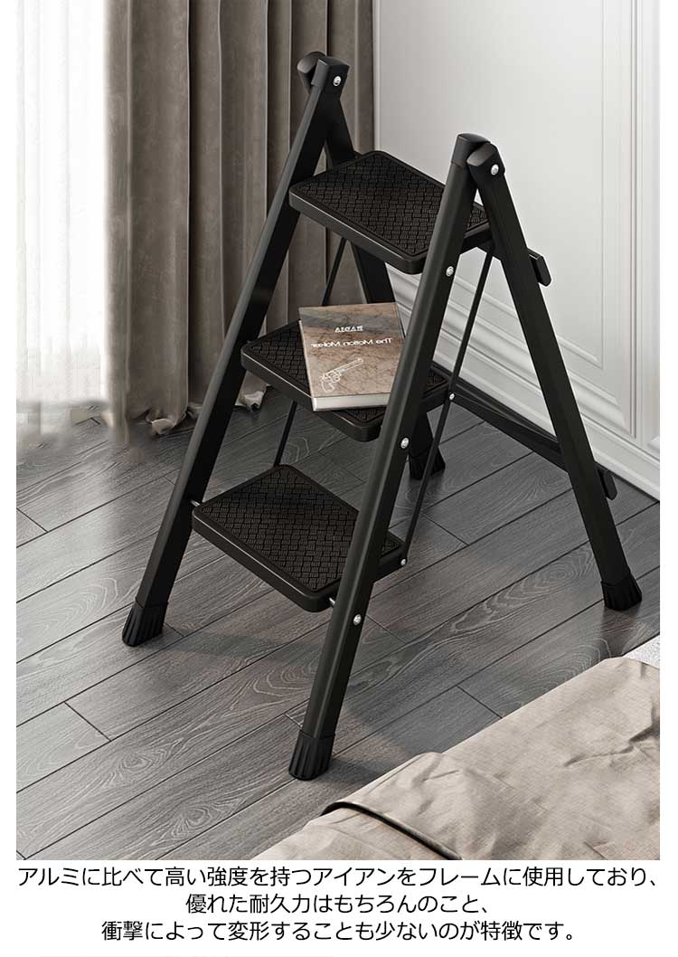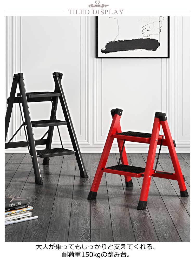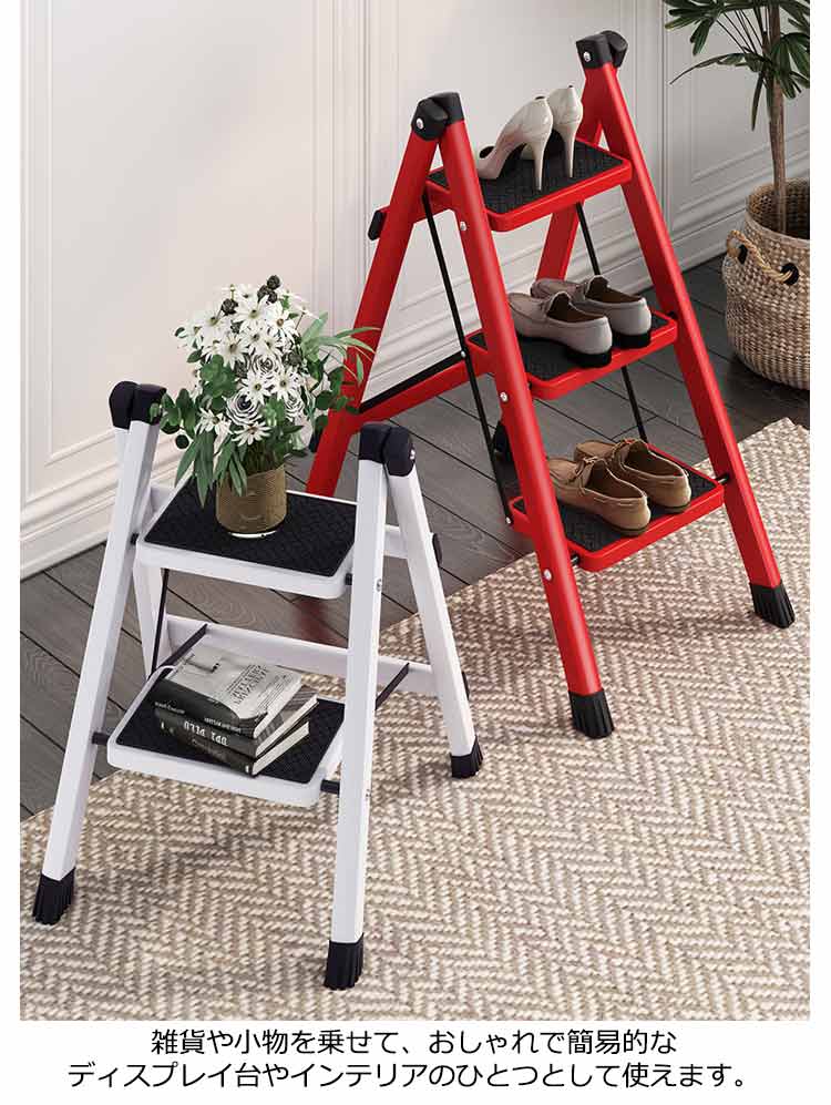 | 3段 耐荷重150kg 大人が乗ってもしっかりと支えてくれる、耐荷重150kgの踏み台 雑貨や小物を乗せて、おしゃれで簡易的なディスプレイ台やインテリアのひとつとして使えます。 ステップ部分には滑り止めも付いているため、キッズステップとしてお子様も安心して使えます。 不要な時はちょっとした隙間にササっと収納できます。 限られたスペースでも使用できるスリムで、お部屋に置いても圧迫感を感じないサイズとなっています。 アルミに比べて高い強度を持つアイアンをフレームに使用しており、優れた耐久力はもちろんのこと、衝撃によって変形することも少ないのが特徴です。 厚い塗膜で覆うため極めて高い強度を持ち、キズが付きにくく、耐熱性?耐油性にも優れています。 脚先には床滑りを軽減してくれるキャップが付属されています。 | |