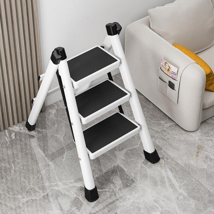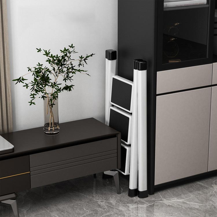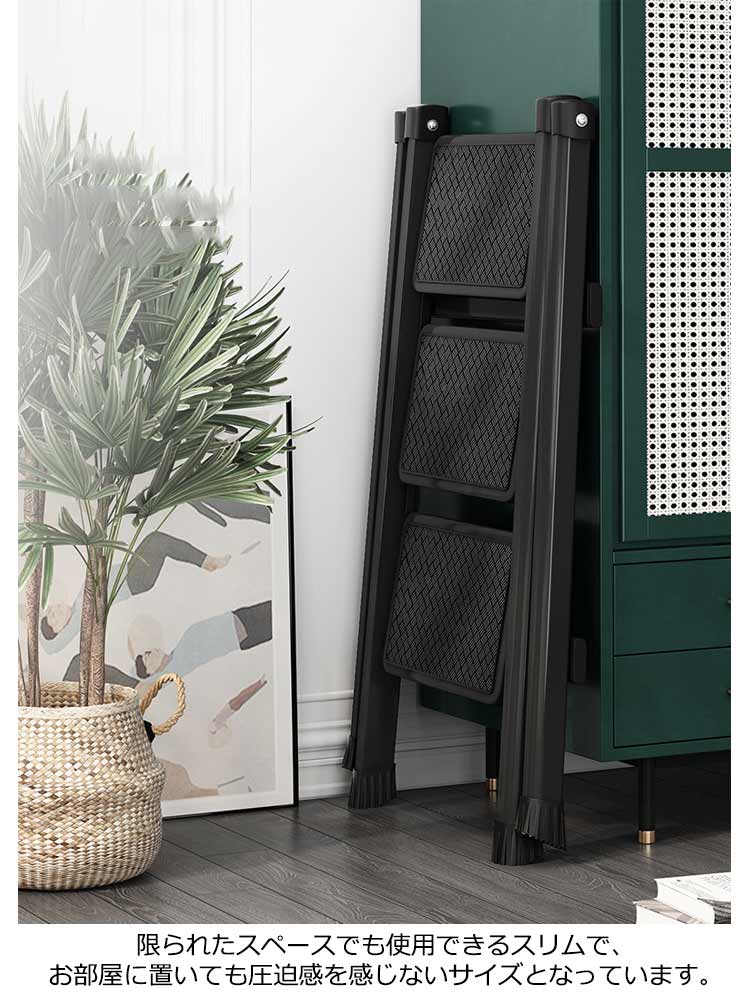 3段耐荷重150kg大人が乗ってもしっかりと支えてくれる、耐荷重150kgの踏み台雑貨や小物を乗せて、おしゃれで簡易的なディスプレイ台やインテリアのひとつとして使えます。ステップ部分には滑り止めも付いているため、キッズステップとしてお子様も安心して使えます。不要な時はちょっとした隙間にササっと収納できます。限られたスペースでも使用できるスリムで、お部屋に置いても圧迫感を感じないサイズとなっています。アルミに比べて高い強度を持つアイアンをフレームに使用しており、優れた耐久力はもちろんのこと、衝撃によって変形することも少ないのが特徴です。厚い塗膜で覆うため極めて高い強度を持ち、キズが付きにくく、耐熱性・耐油性にも優れています。脚先には床滑りを軽減してくれるキャップが付属されています。