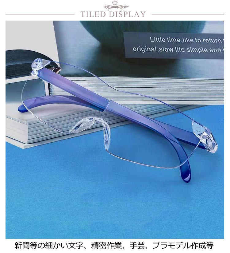 | 眼鏡の上からそのままかけられる軽くクリアな視界で快適の眼鏡ルーペ。 小さな文字もはっきり見える、無理の無い体勢で文字を読めます。 痛くなりにくい快適なノーズパットを採用、品質とコストにこだわった逸品です。 新聞等の細かい文字、精密作業、手芸、プラモデル作成等、 幅広くどんなシーンでもお使いいただけます。男女兼用でお使いいただけます。 | |
