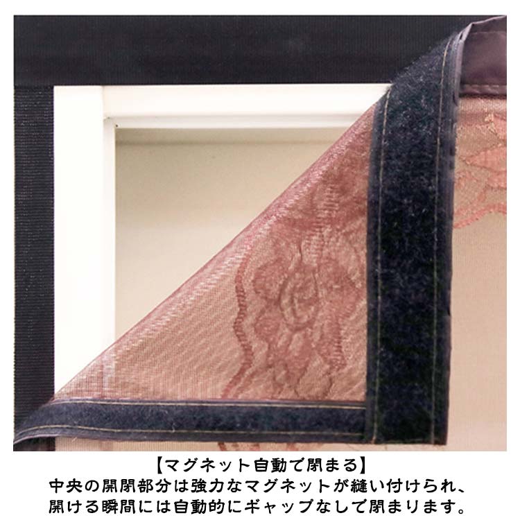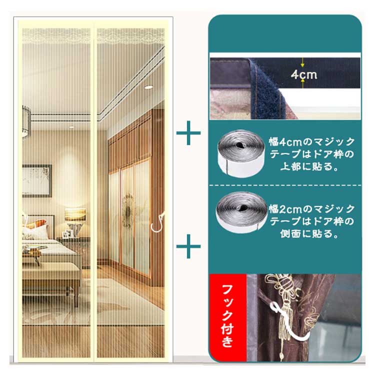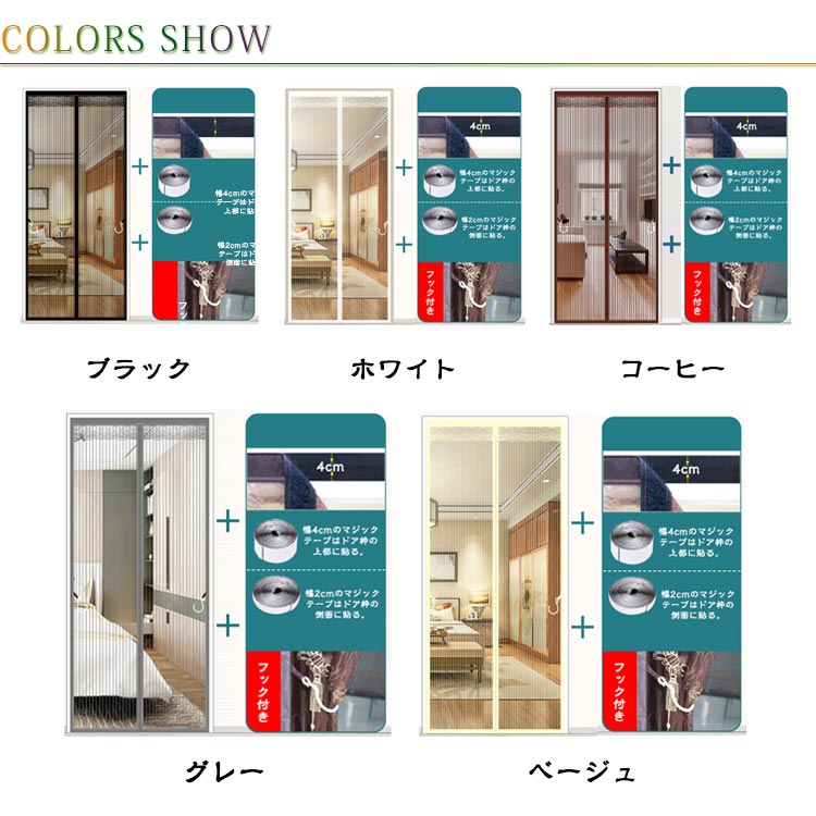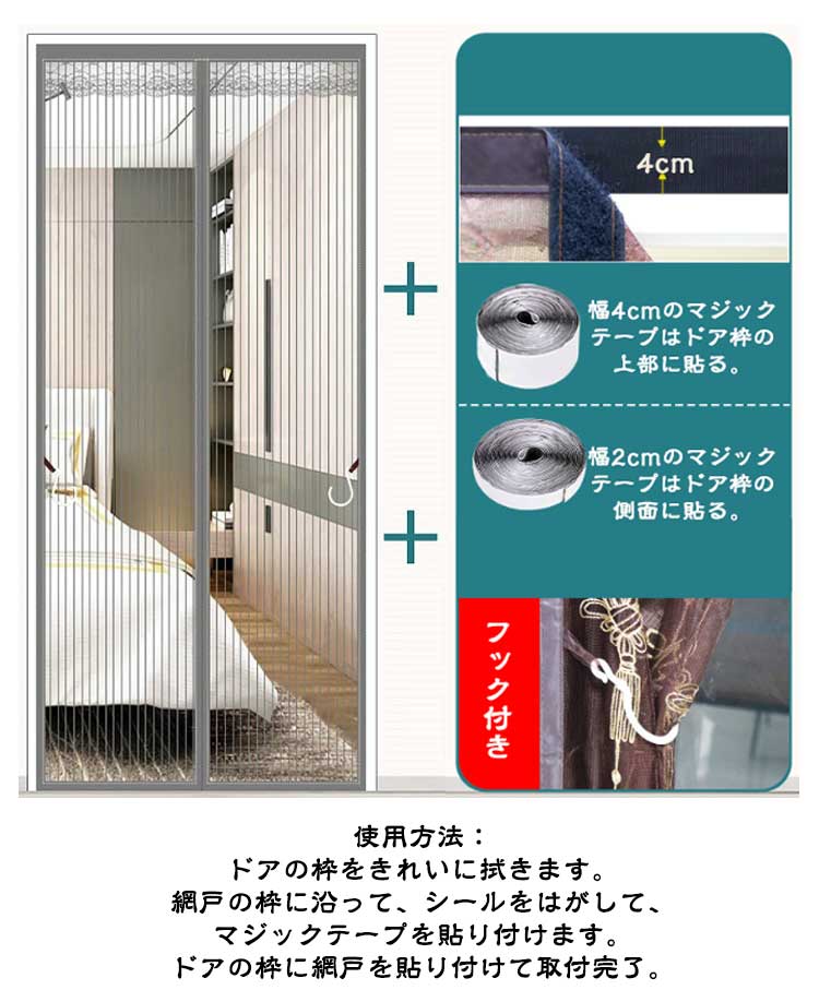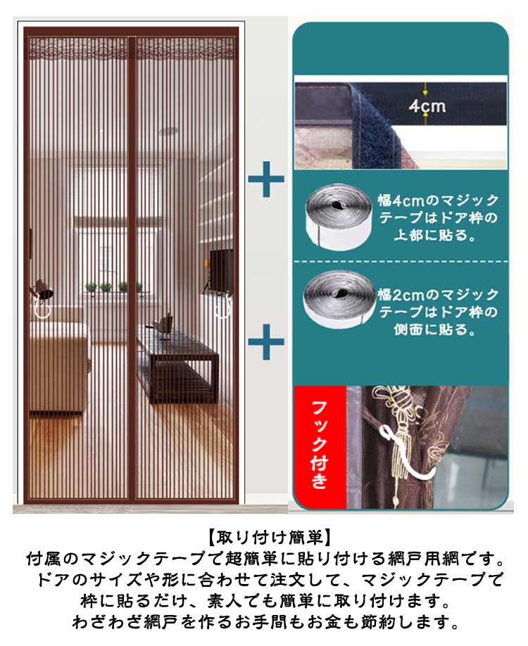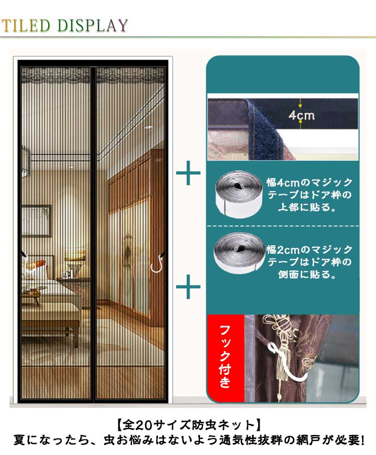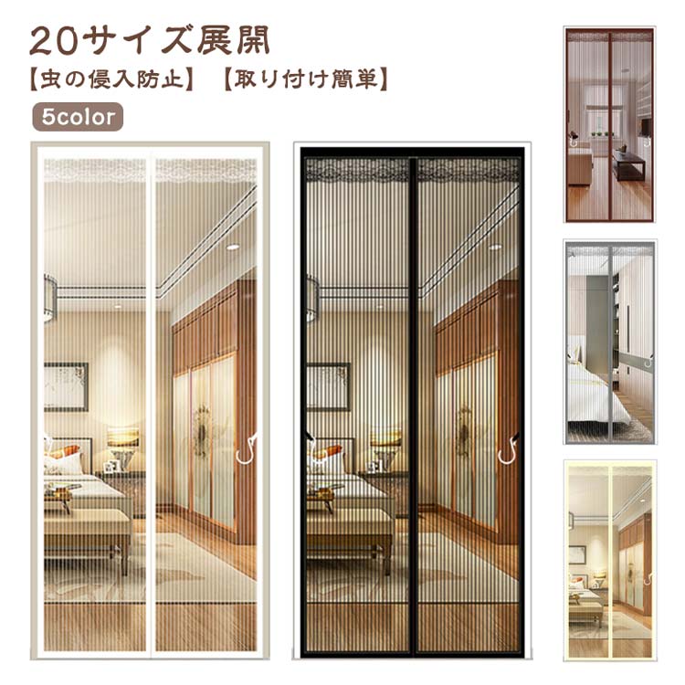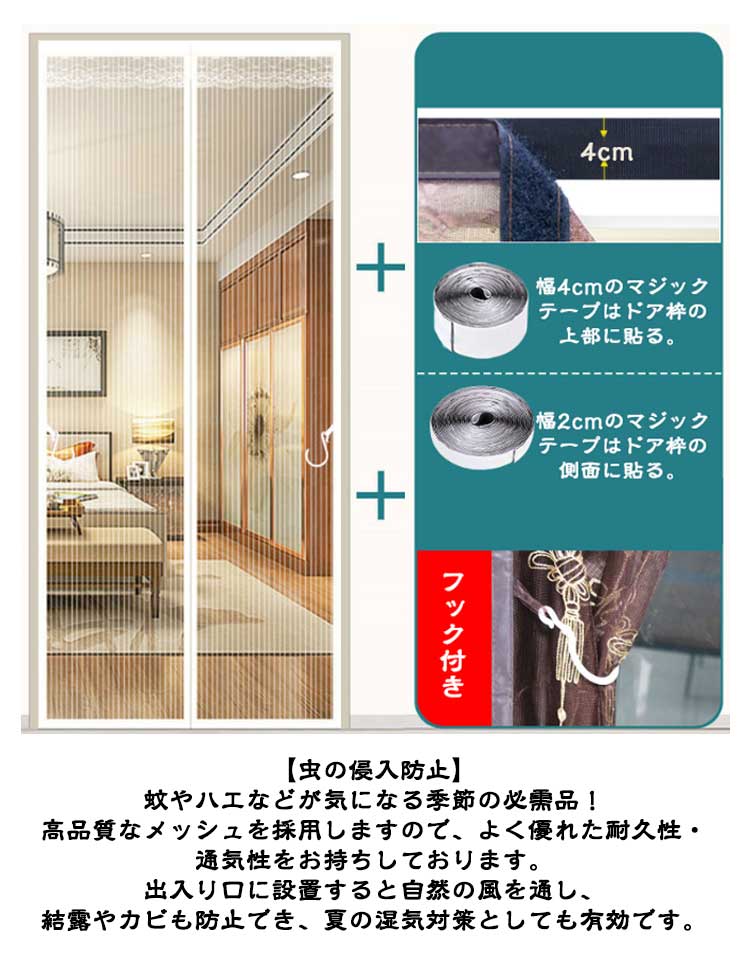 【全20サイズ防虫ネット】夏になったら、虫お悩みはないよう通気性抜群の網戸が必要!【マグネット自動で閉まる】中央の開閉部分は強力なマグネットが縫い付けられ、開ける瞬間には自動的にギャップなしで閉まります。【高品質】網目が細かく、玄関などに設置して虫を防止し、夏でも風通しを快適に、省エネ効果も期待できます。耐久性が高く長く使える。掃除しやすく空気の流れが良い。優れた靱性を持ち、衝撃に強く貼り作業性良好。【虫の侵入防止】蚊やハエなどが気になる季節の必需品!高品質なメッシュを採用しますので、よく優れた耐久性・通気性をお持ちしております。出入り口に設置すると自然の風を通し、結露やカビも防止でき、夏の湿気対策としても有効です。【取り付け簡単】付属のマジックテープで超簡単に貼り付ける網戸用網です。ドアのサイズや形に合わせて注文して、マジックテープで枠に貼るだけ、素人でも簡単に取り付けます。わざわざ網戸を作るお手間もお金も節約します。使用方法:ドアの枠をきれいに拭きます。網戸の枠に沿って、シールをはがして、マジックテープを貼り付けます。ドアの枠に網戸を貼り付けて取付完了。