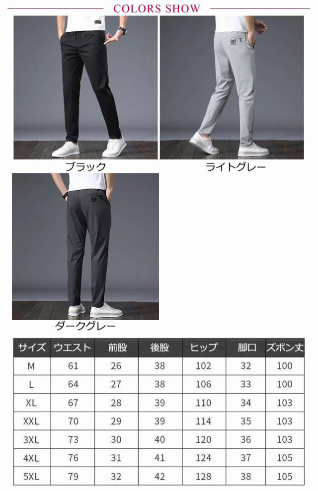 | 接触冷感仕様の生地が汗を吸っても素早く乾く、通気性に優れてムレ感を軽減、春夏の定番メンズパンツ カジュアルな見た目ながらも、無駄な装飾を施さないシンプルなデザイン 驚くほど伸びる伸縮自在のストレッチ素材を採用 弾性のある紐はウエストのサイズを調整できる | |