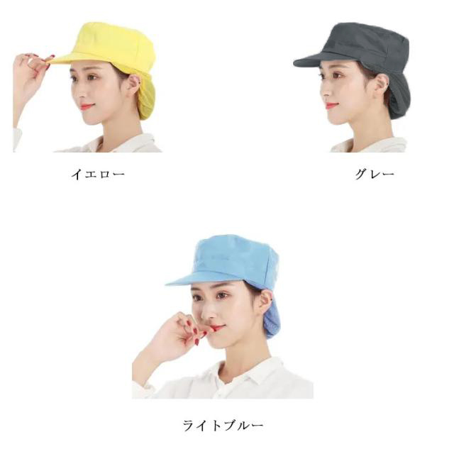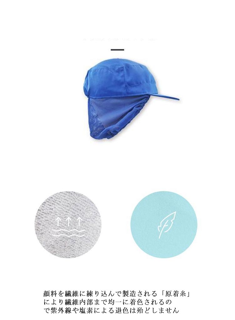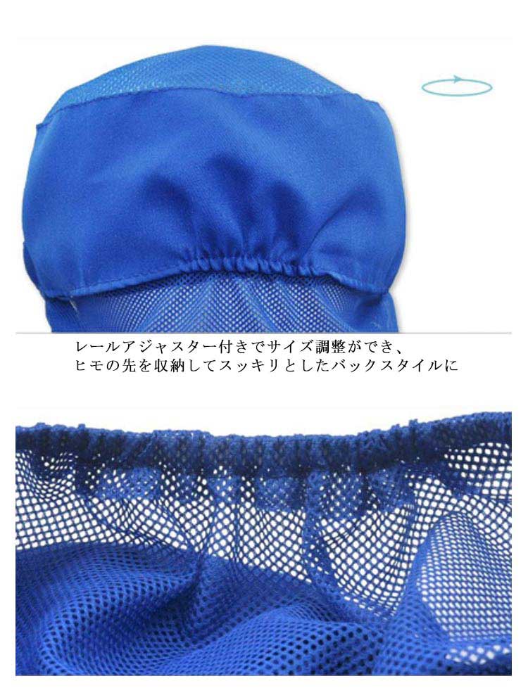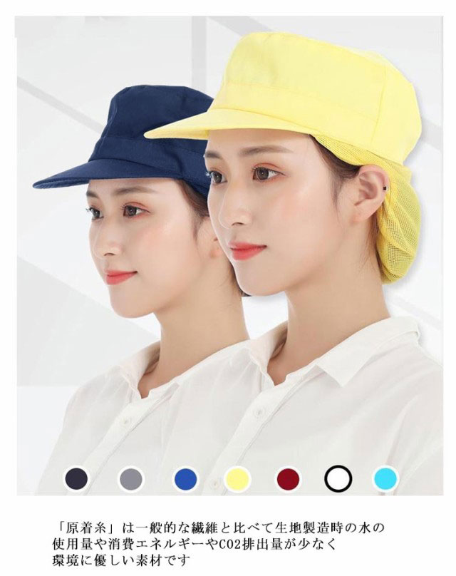 ・キッチンハイターなどの塩素系漂白剤が付いても色落ちしない塩素消毒に強い衛生キャップ・頭髪落下を防止するたれ付きの食品衛生帽子です・調理や接客の際に必要なマスクを留められるマスク掛けが付いていて耳が痛くなるのを防止します・顔料を繊維に練り込んで製造される「原着糸」により繊維内部まで均一に着色されるので紫外線や塩素による退色は殆どしません・「原着糸」は一般的な繊維と比べて生地製造時の水の使用量や消費エネルギーやCO2排出量が少なく環境に優しい素材です・静電気の発生を抑えてチリやホコリなどの付着を軽減する制電機能付き・レールアジャスター付きでサイズ調整ができ、ヒモの先を収納してスッキリとしたバックスタイルに