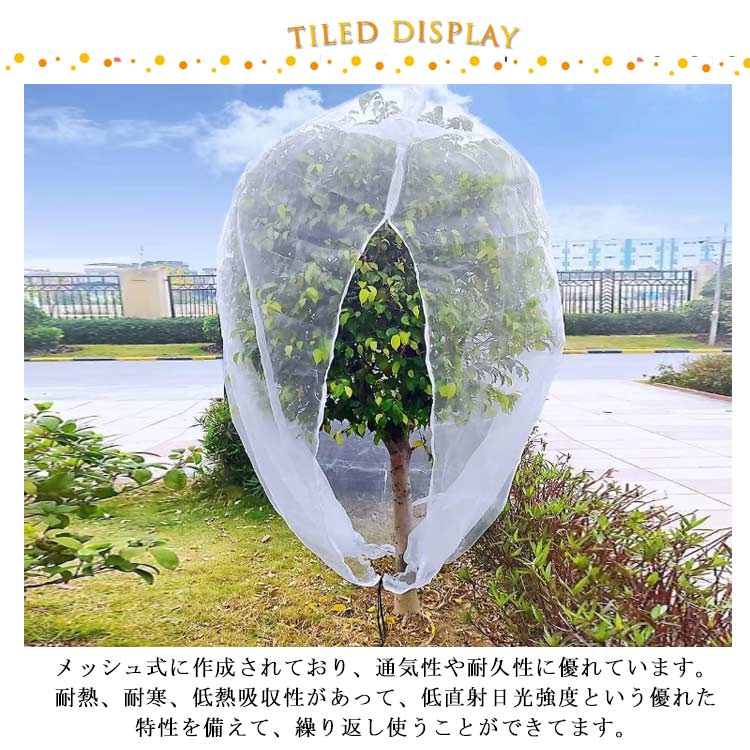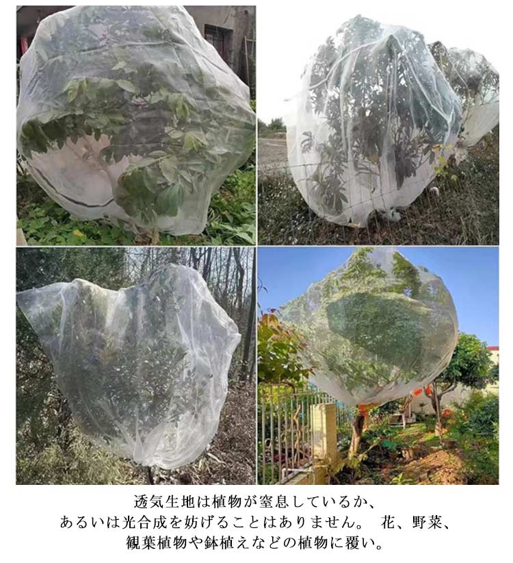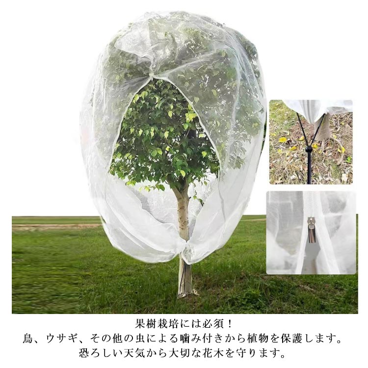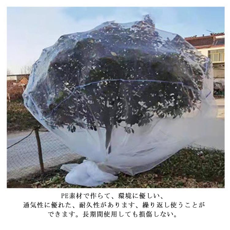 メッシュ式に作成されており、通気性や耐久性に優れています。耐熱、耐寒、低熱吸収性があって、低直射日光強度という優れた特性を備えて、繰り返し使うことができてます。PE素材で作らて、環境に優しい、通気性に優れた、耐久性があります、繰り返し使うことができます。長期間使用しても損傷しない。果樹栽培には必須!鳥、ウサギ、その他の虫による噛み付きから植物を保護します。恐ろしい天気から大切な花木を守ります。 透気生地は植物が窒息しているか、あるいは光合成を妨げることはありません。 花、野菜、観葉植物や鉢植えなどの植物に覆い。ファスナー付きタイプなので、樹木に被せてファスナーを締めるだけの簡単取付け。広い開口部により、花や木に直接覆って、プラントの高さや大きさに合わせて自由に保護カバーを調整することができます。