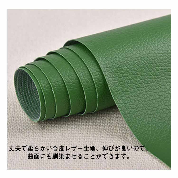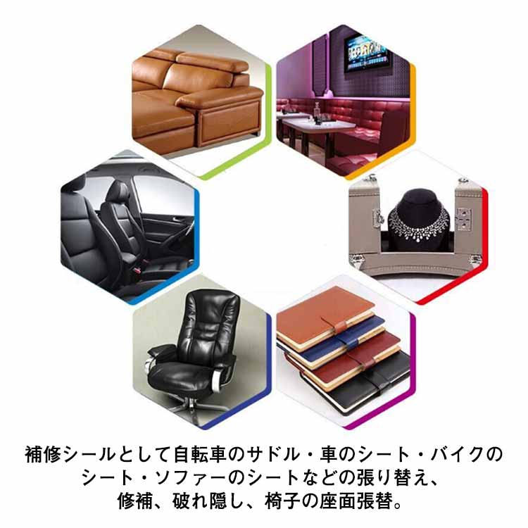 便利な貼るレザー登場!ソファーや椅子などの破れ、カギザキなどにたっぷり使える大判サイズです。丈夫で柔らかい合皮レザー生地、伸びが良いので、曲面にも馴染ませることができます。豊富なカラーバエーション気軽に、インテリアのイメージチェンジも楽しめます!自分好みのインテリアが実現!補修シールとして自転車のサドル・車のシート・バイクのシート・ソファーのシートなどの張り替え、修補、破れ隠し、椅子の座面張替。