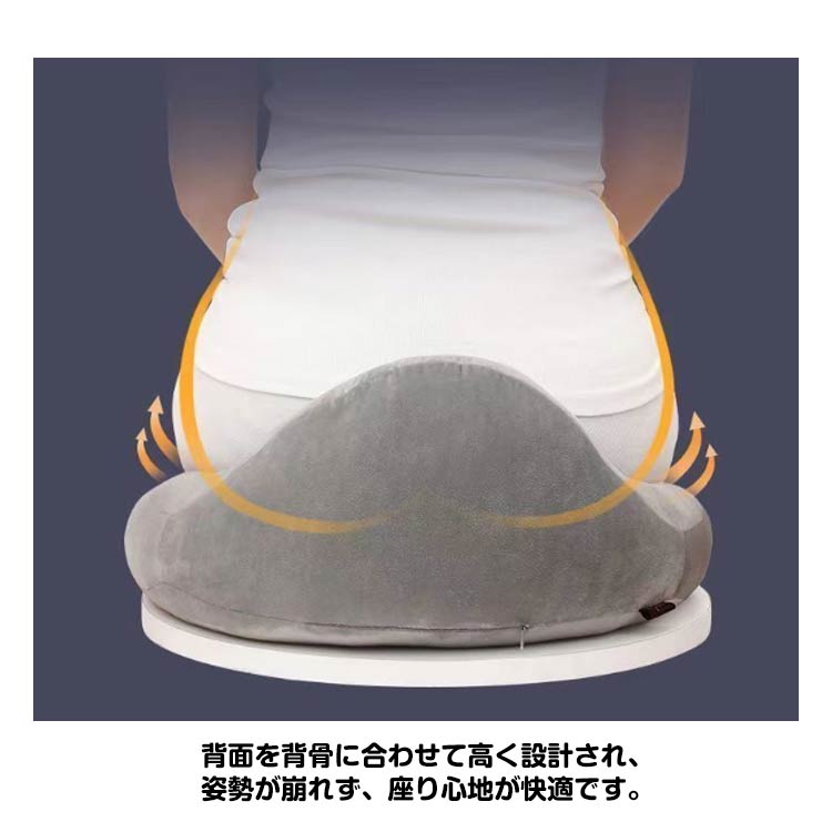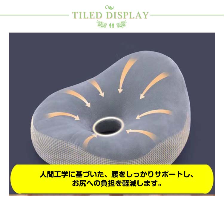 会陰部~お尻にかけて座った時に地面に触れないようにドーナツ型クッションです。人間工学に基づいた、腰をしっかりサポートし、お尻への負担を軽減します。背面を背骨に合わせて高く設計され、姿勢が崩れず、座り心地が快適です。カバーは着脱式を採用し、ご家庭の洗濯機で簡単に洗うことができます。痔、腰痛持ちの方、妊娠中、産後の女性や長時間座っているの方におすすめです。